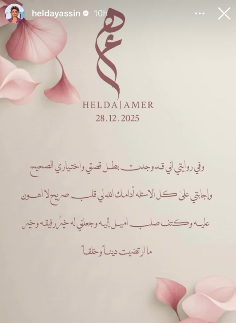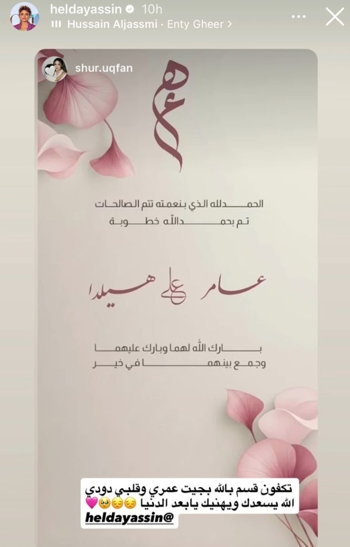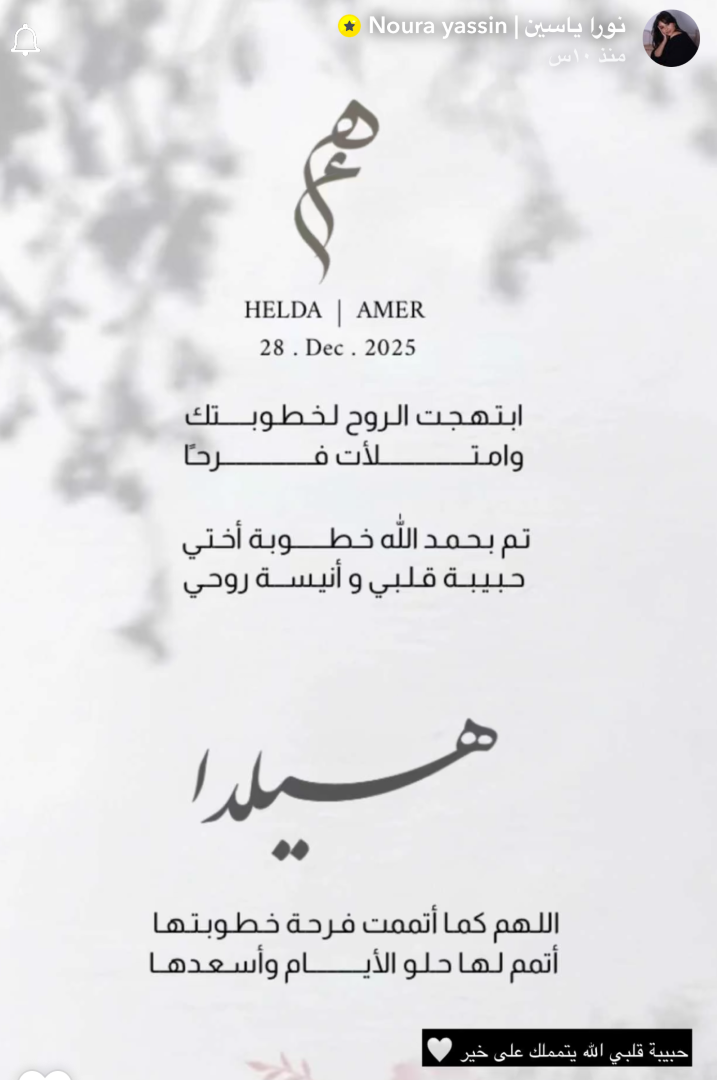 كما شاركت هيلدا ياسين بطاقة كُتب فيها: "الحمد لله الذي بنعمته تتم الصالحات، تم بحمد الله خطوبة عامر على هيلدا، بارك الله لهما وجمع بينهما في الخير".