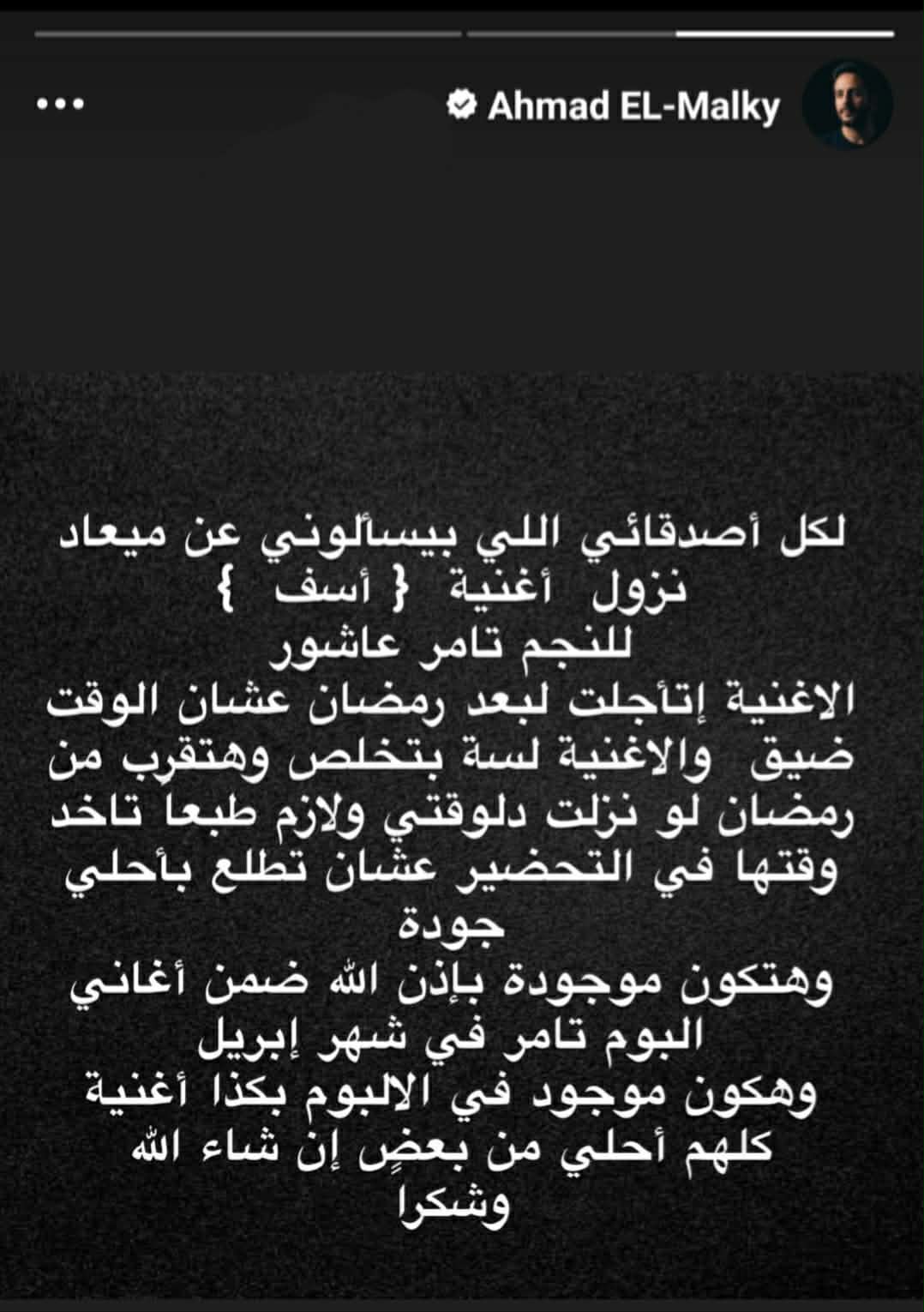 وكشف الشاعر أحمد المالكي، صاحب أغنية "آسف" عن سبب تأجيل طرحها المفاجئ، رغم ترقب جمهور تامر عاشور لها، قائلًا عبر خاصية الـ"ستوري" على فيس بوك": "لكل أصدقائي اللي بيسألوني عن ميعاد نزول أغنية (أسف) للنجم تامر عاشور، الأغنية إتأجلت لبعد رمضان عشان الوقت ضيق والأغنية لسه بتخلص وهتقرب من رمضان لو نزلت دلوقتي، ولازم طبعًا تاخد وقتها في التحضير عشان تطلع بأحلى جودة".موعد طرح ألبوم تامر عاشور 2026