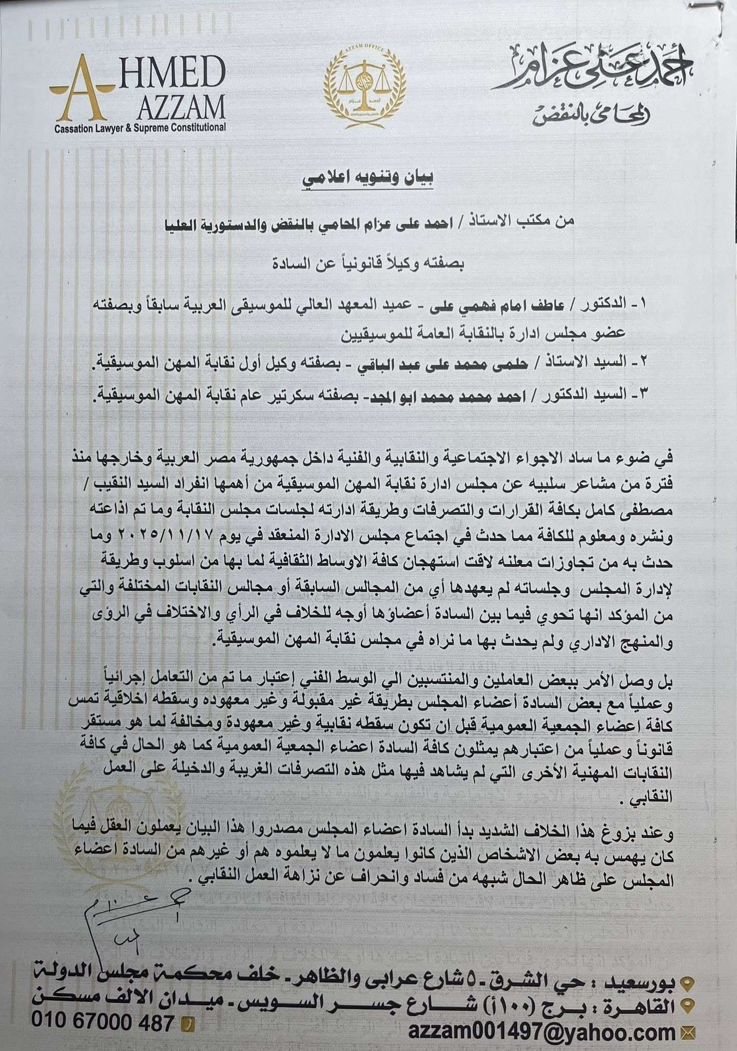 بيانٍ ثلاثي مجلس نقابة المهن الموسيقية - الصورة من الحساب الخاص بالمحامي أحمد عزام على فيس بوك