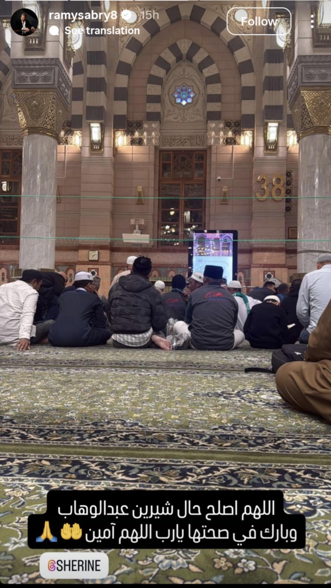 قام رامي صبري بالدعاء لها أثناء زيارته للمسجد النبوي متمنياً لها تجاوز الأزمات التي تمر بها منذ فترة، ونشر رامي عبر ستوري حسابه على إنستغرام صورة من داخل المسجد وكتب عليها تعليق قال فيه: "اللهم أصلح حال شيرين عبدالوهاب، وبارك في صحتها يارب، اللهم أمين".وقد تفاعل الجمهور مع اللافته الإنسانية التي قام بها رامي صبري، وأكد البعض أن شيرين بحاجة للدعوات الصادقة من محبيها حتى تستطيع تجاوز الأزمة الكبيرة التي تمر بها، وتمنوا لها أن تكون في أفضل حال وتعود للساحة الغنائية في أقرب وقت.
