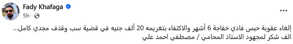 شهدت قضية الفنان فادي خفاجة، في اتهامه بسب وقذف الفنان مجدي كامل، زوج الفنانة مها أحمد، تطورات جديدة، عصر اليوم الثلاثاء 20 يناير، وذلك بعدما سبق وحصل على حكمٍ بالحبس لمدة 6 أشهر وتغريمه 20 ألف جنيه، يوم 24 نوفمبر الماضي.