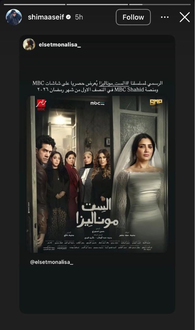 وبدورها، حسمت الفنانة شيماء سيف موعد عرض مسلسل "الست موناليزا" خلال النصف الأول أم الثاني من رمضان 2026، موضحة عبر خاصية الـ"ستوري" على "إنستغرام"، أنّ المسلسل سيُعرض خلال النصف الأول عبر قناة "MBC مصر".