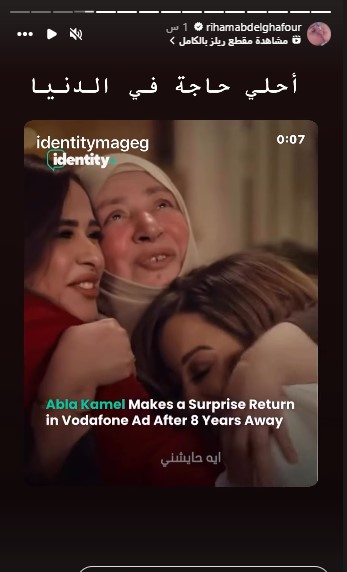 وفي السياق ذاته، أبدى عدد من النجوم عن سعادتهم لظهور الفنانة عبلة كامل مجدداً على الشاشة الصغيرة، من بين هؤلاء النجمة ريهام عبد الغفور، والتي قررت أن تحتفي بهذا الحدث بطريقتها الخاصة، إذ شاركت متابعيها مقطع فيديو من الإعلان، عبر خاصية " الاستوري" التابعة لحسابها الرسمي على " انستغرام"، مكتوب عليه.." أحلى حاجة في الدنيا".