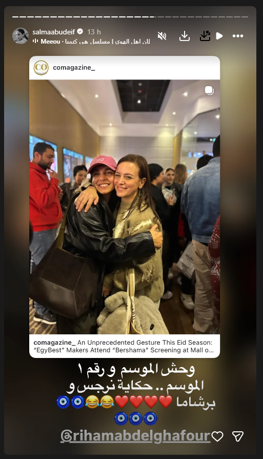 كما لم تُخفِ سلمى أبو ضيف إعجابها بالفنانة ريهام عبد الغفور، خاصة بعد نجاحها اللافت في موسم رمضان 2026، وكذلك خلال موسم عيد الفطر السينمائي، حيث نشرت صورة جمعتهما عقب مشاهدة الفيلم، ووصفتها بـ"نجمة الموسم"، وكتبت: "وحش الموسم ورقم 1 الموسم، حكاية نرجس وبرشامة".