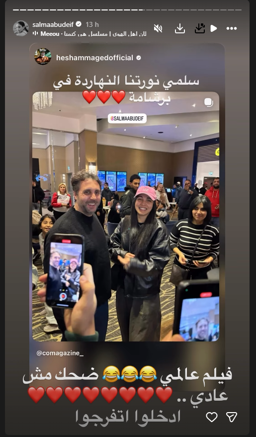 من جانبه، رحّب الفنان هشام ماجد بـ سلمى أبو ضيف عبر استوري حسابه على "إنستغرام"، بنشر صورة جمعتهما بعد مشاهدة فيلم "برشامة" وعلق عليها: "سلمى نورتينا النهاردة في برشامة"، وهو ما ردت عليه سلمى بإشادة واضحة بالفيلم، إذ كتبت: "فيلم عالمي.. ضحك مش عادي ادخلوا اتفرجوا".