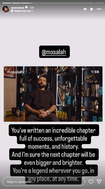 أما الفنانة آيتن عامر، فنشرت مقطع فيديو قصيراً عبر خاصية "الإستوري" التابعة لحسابها الرسمي على "إنستغرام"، تضمن أجمل الأهداف التي أحرزها صلاح بقميص ليفربول في شباك المنافسين، وأرفقت بها رسالة عبرت عن فخرها واعتزازها بمسيرته: "لقد كتبت فصلاً مذهلاً مليئاً بالنجاح واللحظات التي لا تُنسى والتاريخ، وأنا واثقة أن الفصل القادم سيكون أكبر وأكثر إشراقاً.. أنت أسطورة أينما ذهبت في أي مكان وفي أي وقت".
