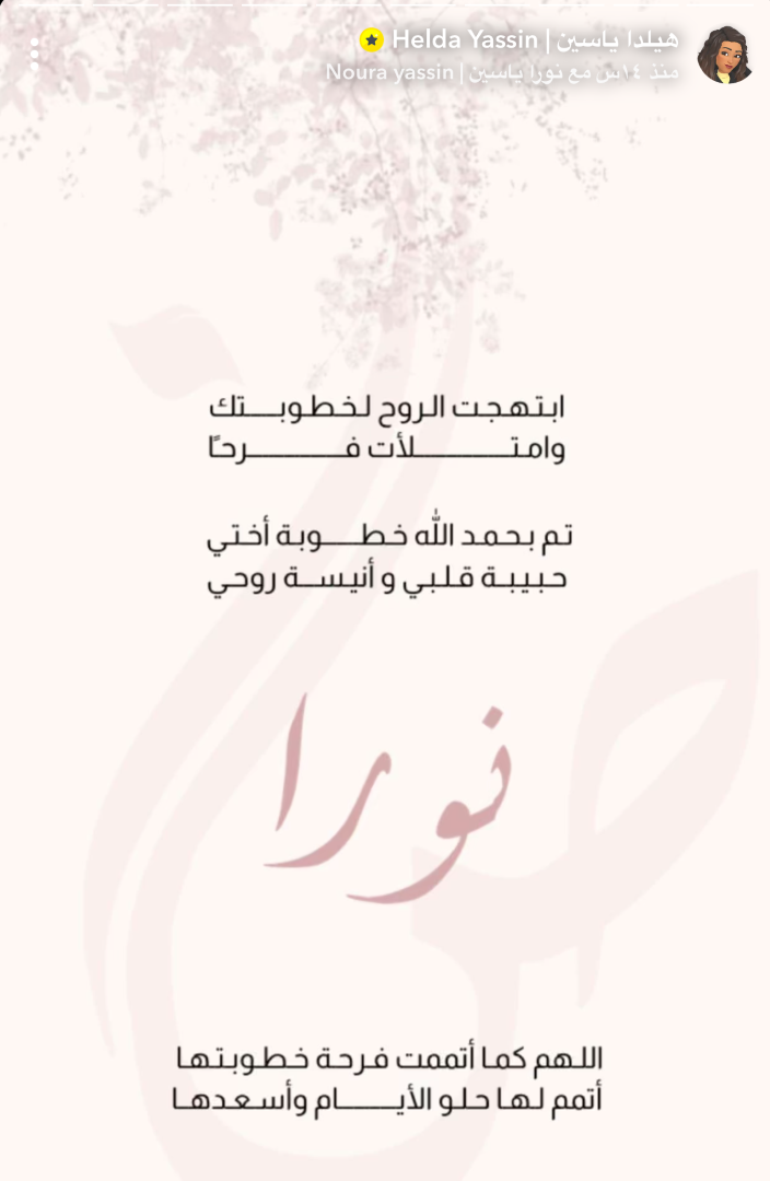 وشاركتها فرحتها شقيقتها الفنانة هيلدا ياسين، حيث كتبت أيضاً منشوراً قالت فيه: "ابتهجت الروح لخطوبتك وامتلأت فرحاً، تم بحمد الله خطوبة أختي حبيبة قلبي وأنيسة روحي نورا، اللهم كما أتممت فرحة خطوبتها أتمم لها حلو الأيام وأسعدها".