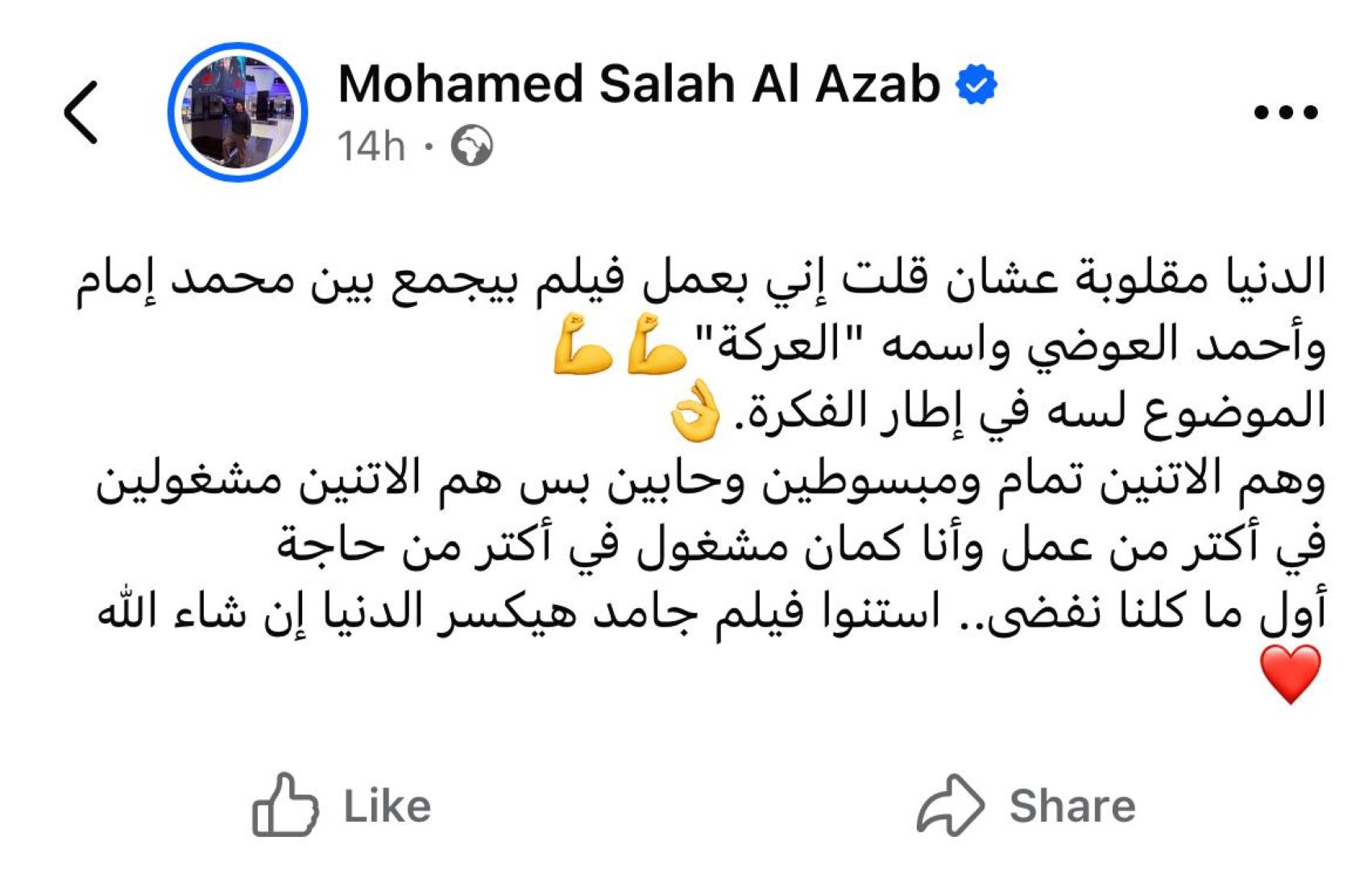 وأوضح محمد صلاح العزب، أن الفيلم لا يزال حاليًا في إطار الفكرة، ولم يدخل حيز التنفيذ، مؤكدًا على وجود ترحيب وحماس كبير من محمد إمام وأحمد العوضي لخوض هذه التجربة السينمائية المشتركة، قائلًا عبر حسابه على "فيس بوك": "الاتنين مشغولين في أكتر من عمل، وأنا كمان مشغول في أكتر من حاجة.. أول ما كلنا نفضى.. استنوا فيلم جامد هيكسر الدنيا إن شاء الله".
