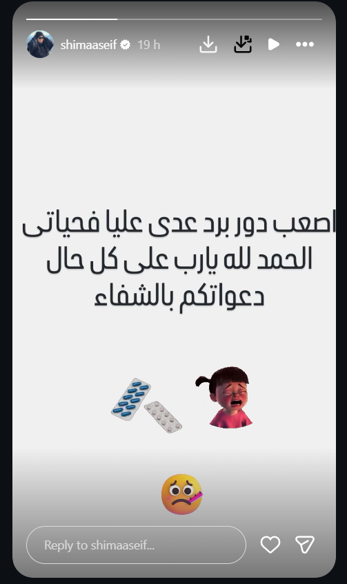 وكشفت شيماء سيف عن تفاصيل حالتها الصحية من خلال خاصية ستوري عبر حسابها الرسمي على موقع إنستغرام، موضحة أنها تمر بواحدة من أصعب نزلات البرد التي تعرضت لها في حياتها، حيث كتبت: "أصعب دور برد عدى عليا في حياتي، الحمد لله على كل حال، دعواتكم بالشفاء"، في رسالة تفاعل معها جمهورها بشكل كبير.