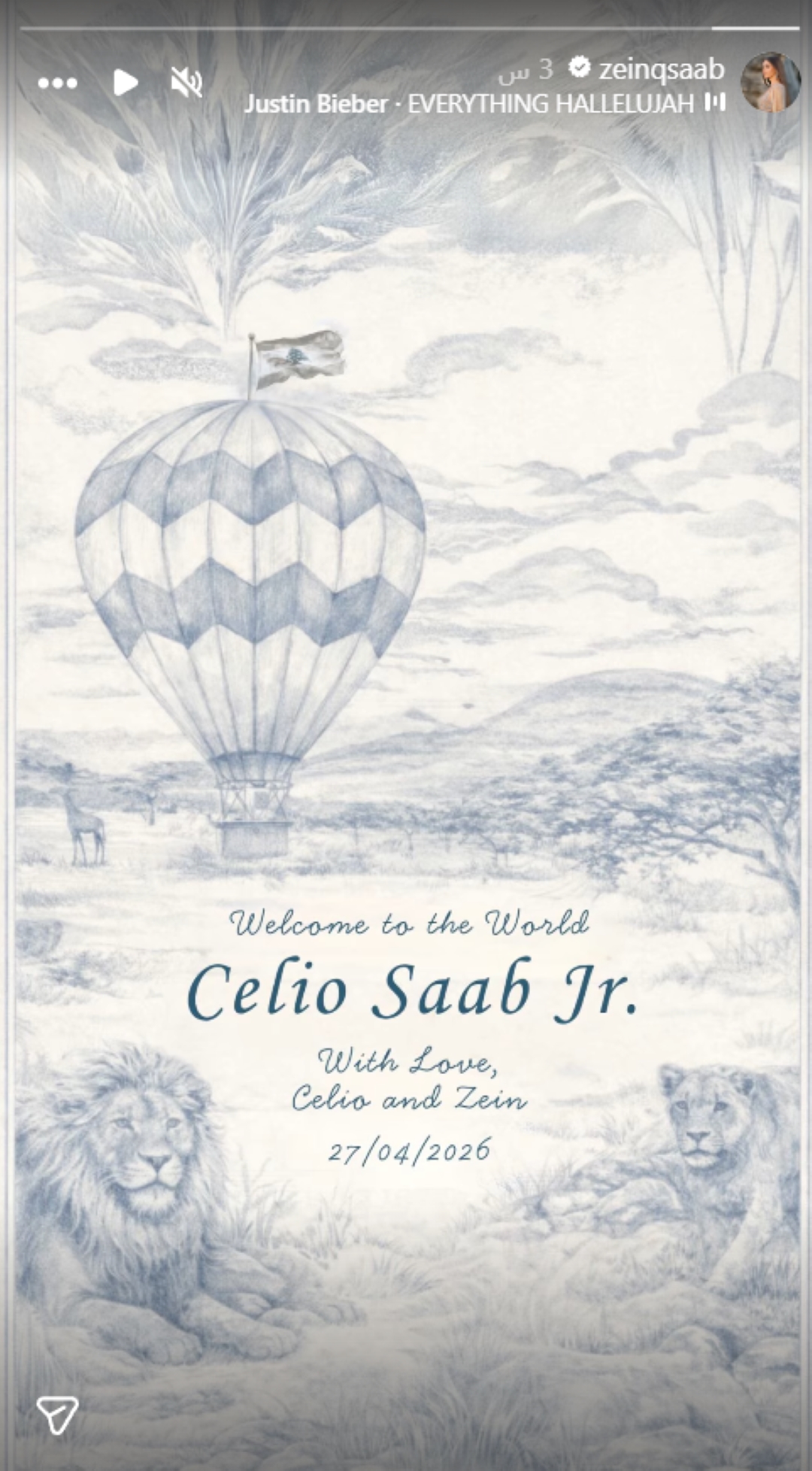 وأعلنت زين قطامي عن ولادة طفلها من خلال منشور لطيف حمل رسومات لحيوانات في الغابة، إلى جانب منطاد مزين بالعلم اللبناني، في إشارة إلى جذور العائلة، مؤكدة أن مولودها الأول وصل إلى الحياة في 27 أبريل 2026.