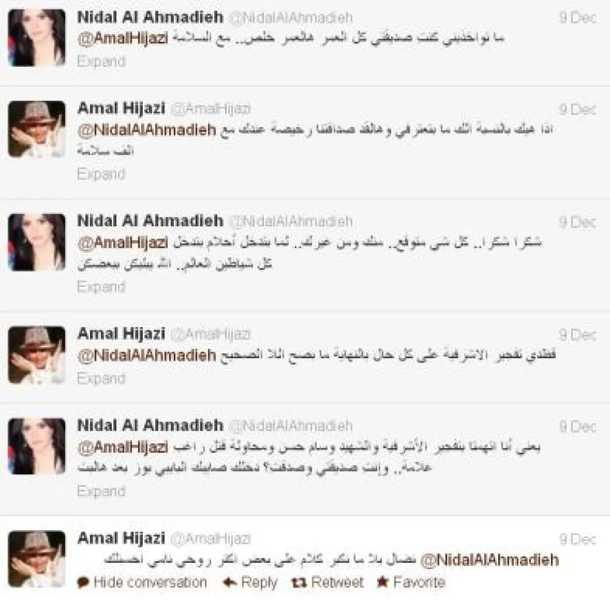 أحلام كانت في زيارة لمنزل أمل التي صدّقت أنّ نضال قامت بنشر أخبار اتّهمت فيها الفنّانة الإماراتيّة بأنّها تقف وراء انفجار الأشرفيّة (الانفجار الذي وقع قبل شهرين وراح ضحيّته رئيس فرع المعلومات اللواء وسام الحسن)، وبأنّها تُخطّط لاغتيال راغب علامة. نضال صُعقت بالاتّهام الذي أكّدت أن لا أساس له من الصّحة، نافية أيّ علاقة لها بنشر هذه الأخبار، إلا أنّ "تويتر" شهد نقاشاً حامياً بين الصّديقتين تحوّل إلى شجار شديد اللهجة.