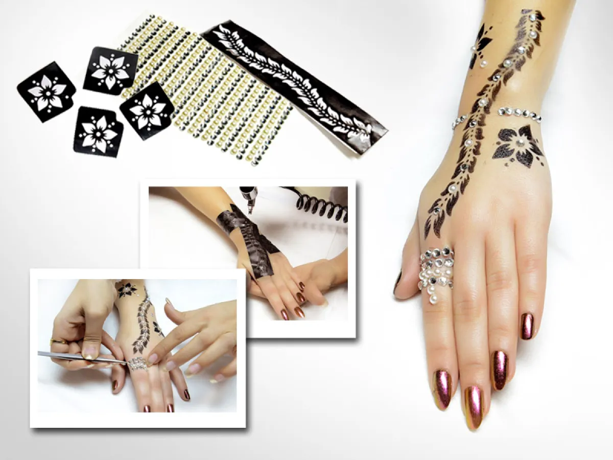 في جديد "خطوات سيدتي نت" لليوم، نتشارك معك كيفيّة الحصول على وشم مؤقّت، لا يختلف عن الحنّة إلا بآلة الـ Airbrush التي يرسم بواسطتها. هذا الوشم مميّز من حيث نقشته وطريقة تزيينه، إذ لا تحتاجين إلى وضع الأكسسوارات، خصوصاً الخاتم، ويكفي أن تُزيّنيه أنت بالستراس، حسب رغبتك.