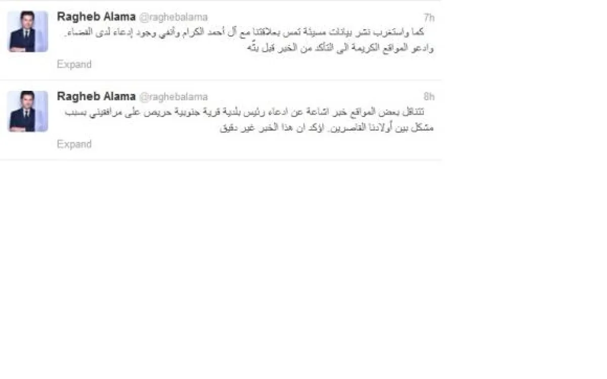 من جهته، لم يتأخر الفنان راغب علامة في الرد، فكتب على صفحته على موقع "تويتر" تغريدة جاء فيها "تتناقل بعض المواقع خبر اشاعة عن ادعاء رئيس بلدية قرية جنوبية حريص على مرافقيّ بسبب مشكل بين اًولادنا القاصرين. اؤكد ان هذا الخبر غير دقيق",