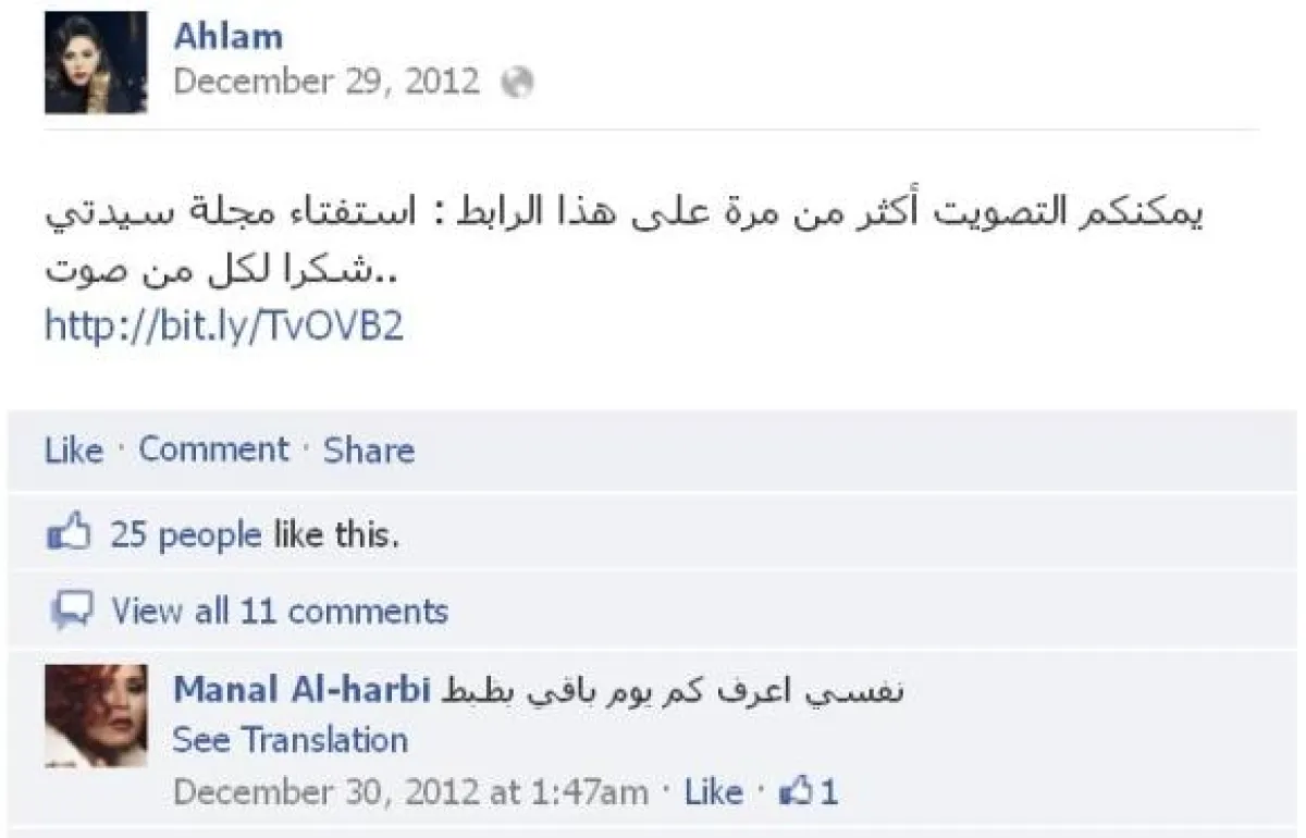 فقد قامت أحلام بدعوة محبيها إلى التصويت لها في استفتاء "سيدتي نت"، وكثفت دعوتها بتذكير محبيها بضرورة التصويت مرة كل "ساعة"، وبدت صفحة أحلام الرسمية مشتعلة بالدعوة للتصويت لها، وهو ما أهلها للتقدّم من المركز الأخير إلى المركز الثالث.