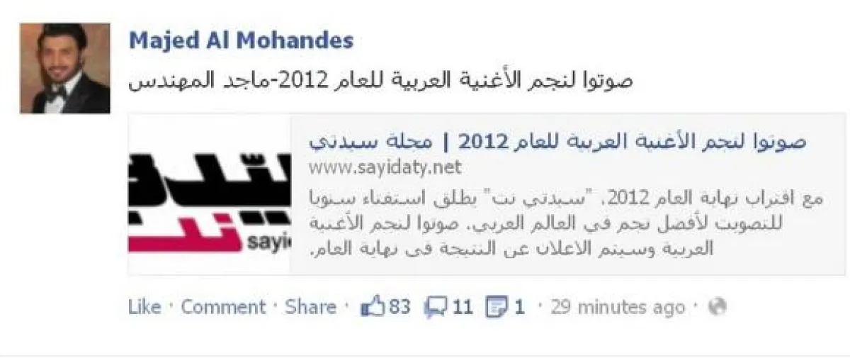 أما أكثر من اهتم بنشر الإستفتاء فهما كاظم وماجد وعاصي الحلاني الذي لا يزال في المرتبة السابعة، وقد شهدت صفحات الكثير من النجوم نشرا لاستفتاء "سيدتي نت" الذي شغل المعجبين واستطاع أن يحرك مواقع التواصل الاجتماعي.