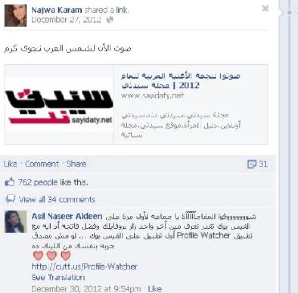 كما قامت صفحة الفنانة نجوى كرم بنشر الإستفتاء مرة جديدة منذ يومين، ونجوى لازالت تحتل المرتبة الخامسة وهي بحاجة لتكثيف التصويت من قبل جمهورها من أجل رفع رصيدها قبل نهاية الاستفتاء.
