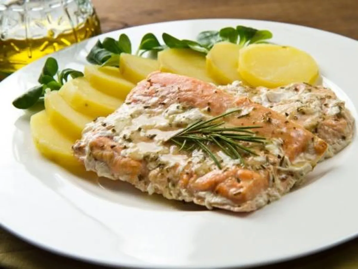 3- يحرّك البقدونس والقبّار مع البطاطس. يعصر الليمون على السلمون، ويقدّم مع خليط البطاطس.