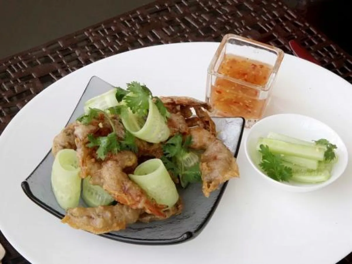 5- يقدّم الروبيان المقلي بجانب الصلصة وسلطة الخيار، ويزيّن هذا الطبق بشرائح الخيار والكزبرة.