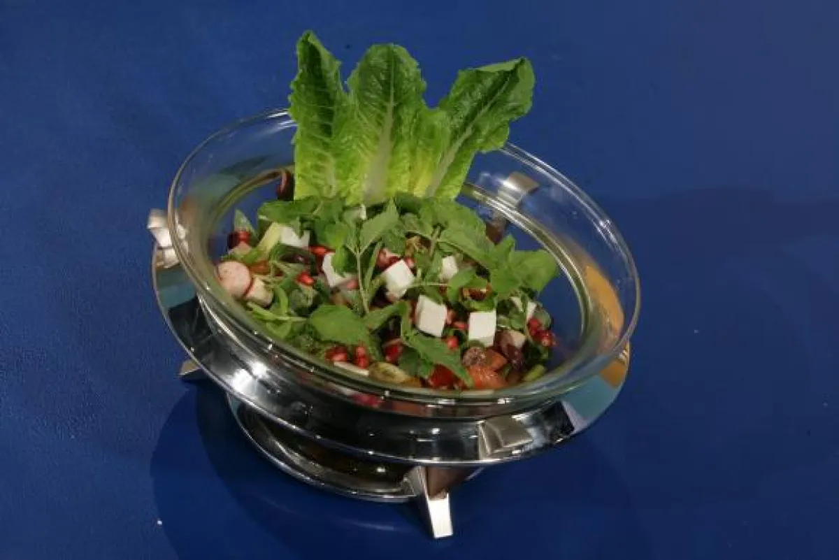 2- بعدها، توضع الجبنة والخبز المحمص فوق السلطة التي تزيّن بالرمّان والخس.