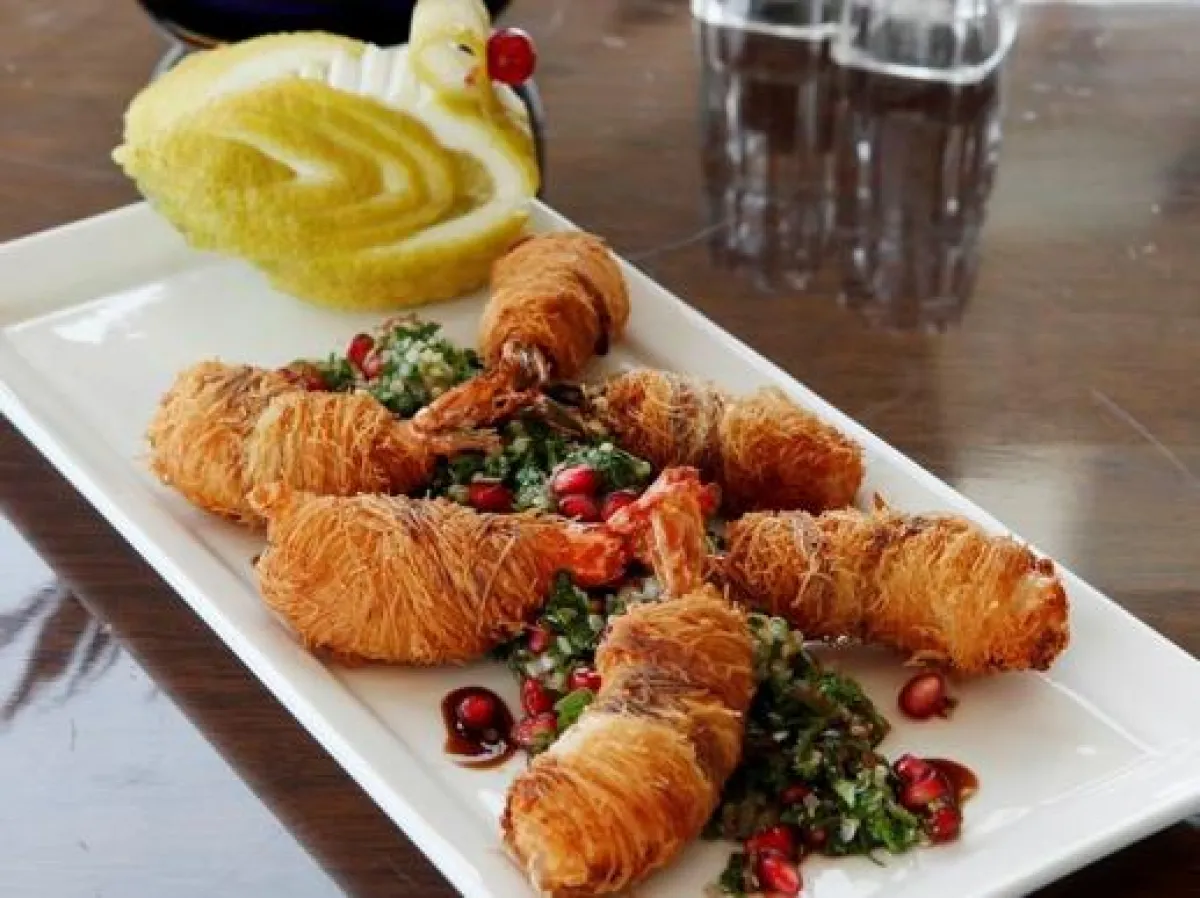 1- لإعداد القريدس الملفوف بالعجينة:يخلط عصير الليمون الحامض مع زيت الزيتون والكمّون والبابريكا والكزبرة والملح والبهار الأسود، وتنقع حبّات القريدس في هذا الخليط لمدة ساعة.ثم، تلفّ حبّات القريدس بعجينة العثملّية، وتقلى في زيت ساخن يوضع في المقلاة على نار قوية إلى حين النضوج، وذلك حتى يصبح لونه ذهبياً.