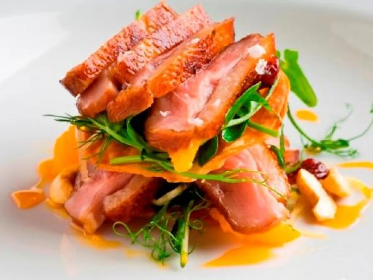 3-في طبق التقديم، توزّع طبقات من الديك الرومي، بينها الجرجير.
