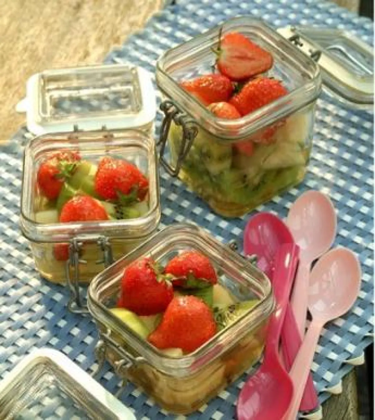 4- توزّع قطع الفاكهة على أطباق، مع توزيع الفراولة بينها، ويسكب الشراب عليها. ويمكن التخفيف من طعم الشراب، عبر إضافة الأناناس أو التوت.