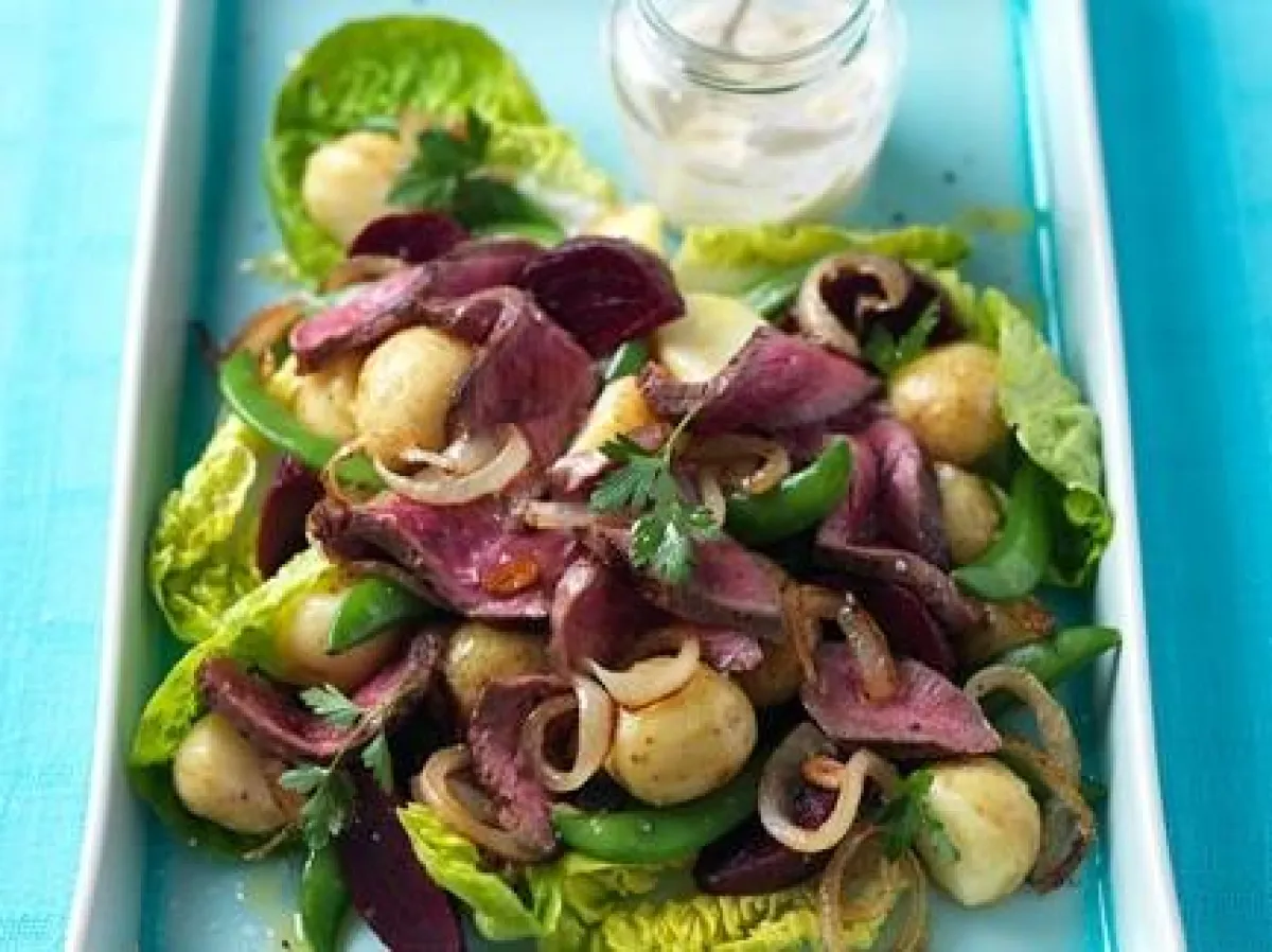 6- تضاف البازيلاء والخس والشمندر، إلى طبق التقديم. يقطع اللحم المطهو إلى شرائح رفيعة ويوزّع فيه، وكذلك البصل والثوم. تسكب العصارة الناتجة عن طهو اللحم والمزيد من زيت الزيتون.