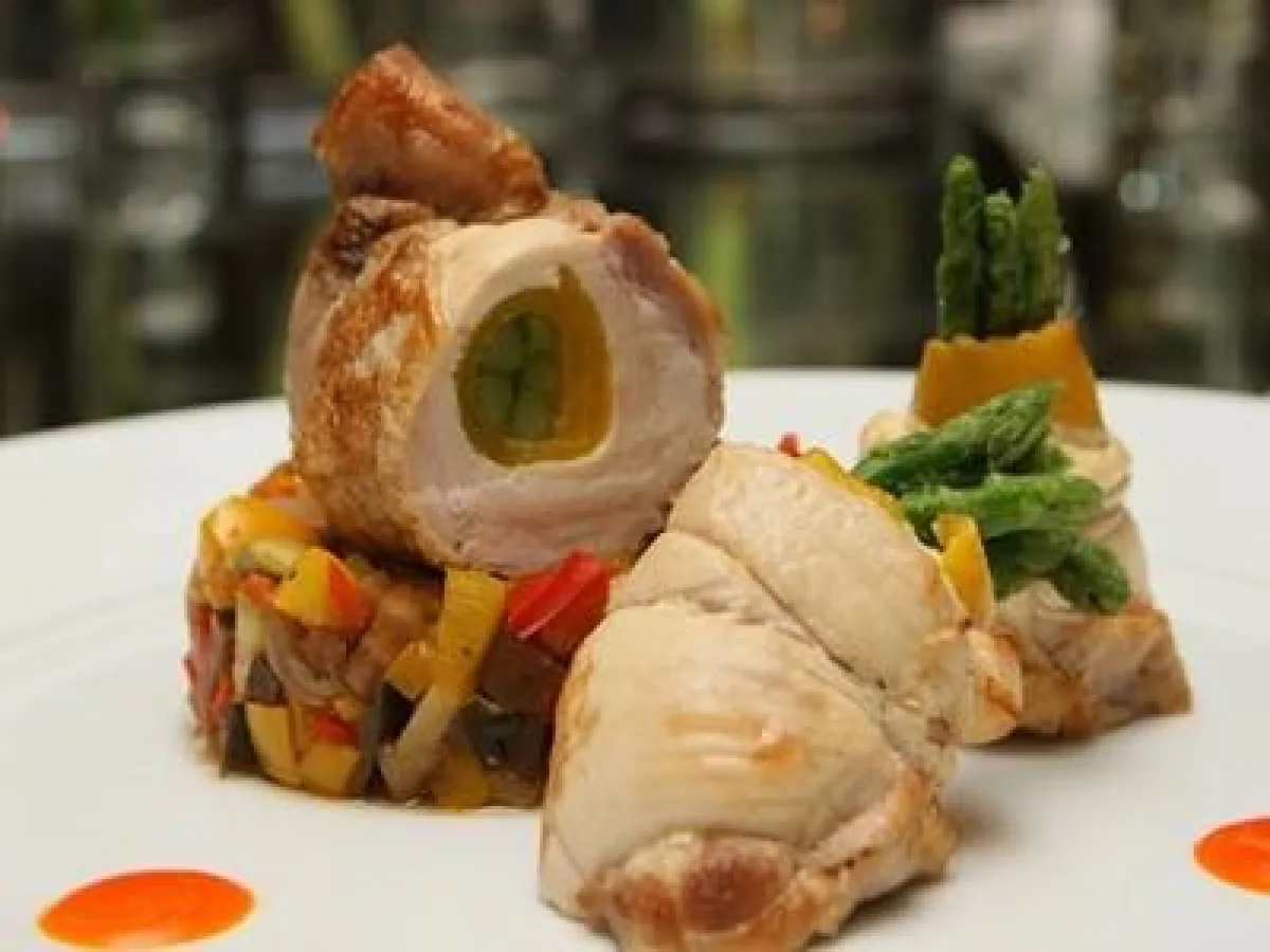 5- في طبق التقديم، توضع الخضراوات وسط القطاعة الدائرية حتى تتخذ شكلها، ثم تسكب في الطبق، مع الدجاج المحشو بالهليون والمقطّع، وتقدّم مع صلصة البرتقال.