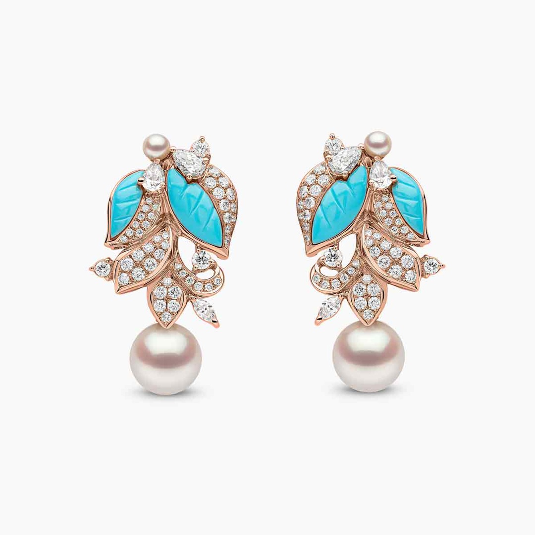 الأقراط مُصممة من الذهب الوردي عيار 18 قيراطاً، وتأتي مرصوفة بالألماس الأبيض بقطع إجاصي ودائري، مع لآليء المياه العذبة، فيما يزين كل قرط حجرين من الفيروز بلونه الأزرق النابض بالحياة.