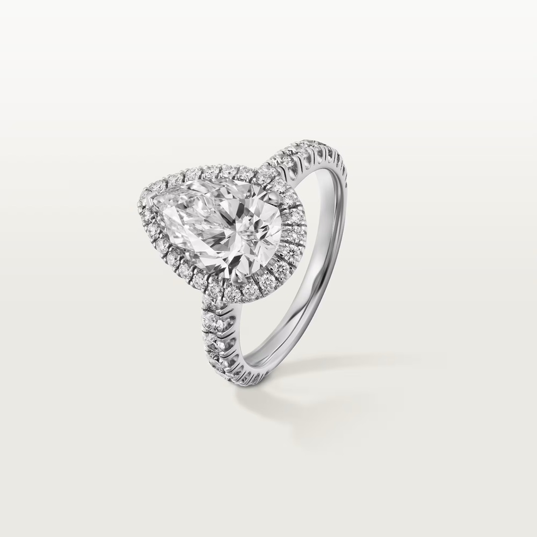 من علامة كارتييه Cartier ، اخترنا لكِ خاتم Cartier Destinée، الذي صُمم من البلاتين، المرصوف بأحجار الألماس الأبيض التي تبدو وكأنها هالة تمنحكِ إشراقة مثالية في شتاء 2026، حيث يتزين الخاتم بألماسة مركزية بقطع إجاصي، مع أحجار ألماس أبيض قطع بافيه، لمزيد من الفخامة والجاذبية.