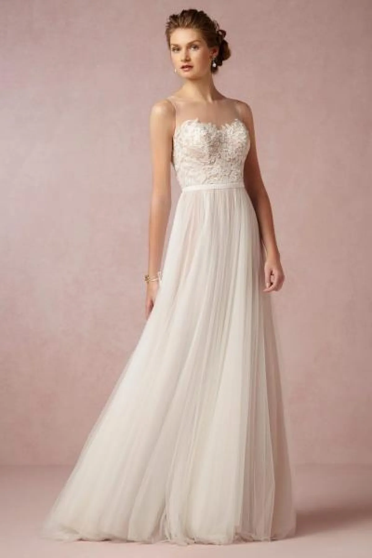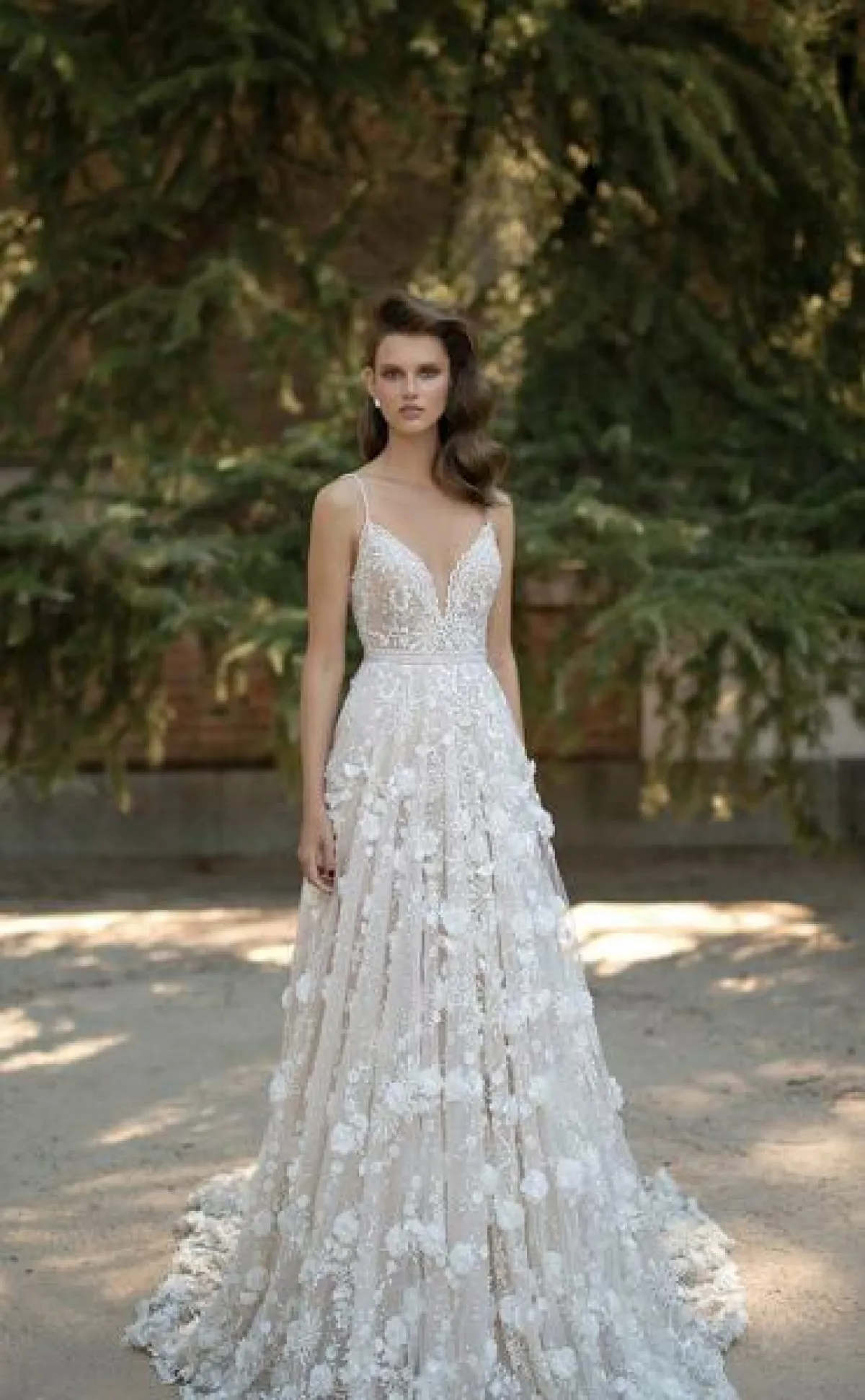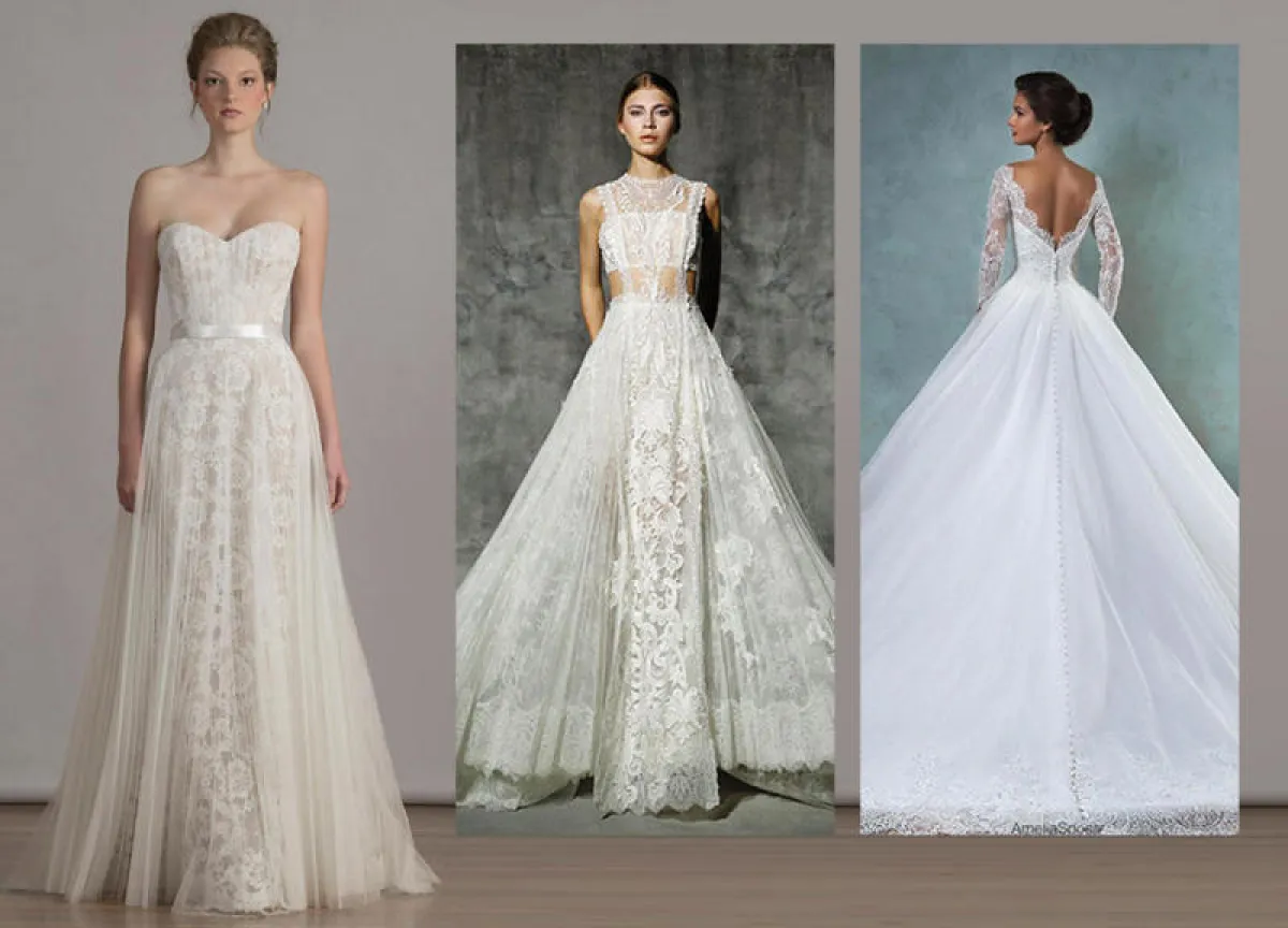 تتنوع ألوان فساتين الزفاف الرومانسية من الأبيض الصافي إلى البيج الخفيف.