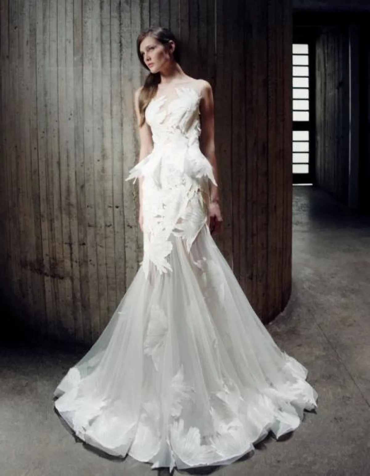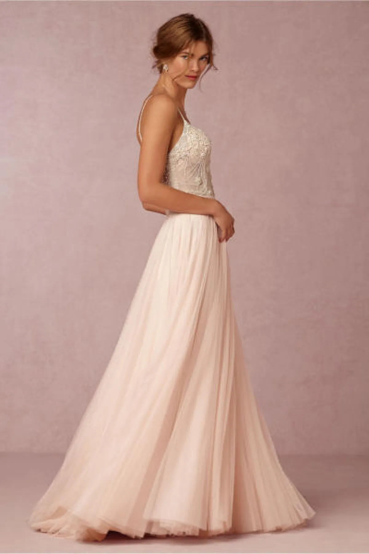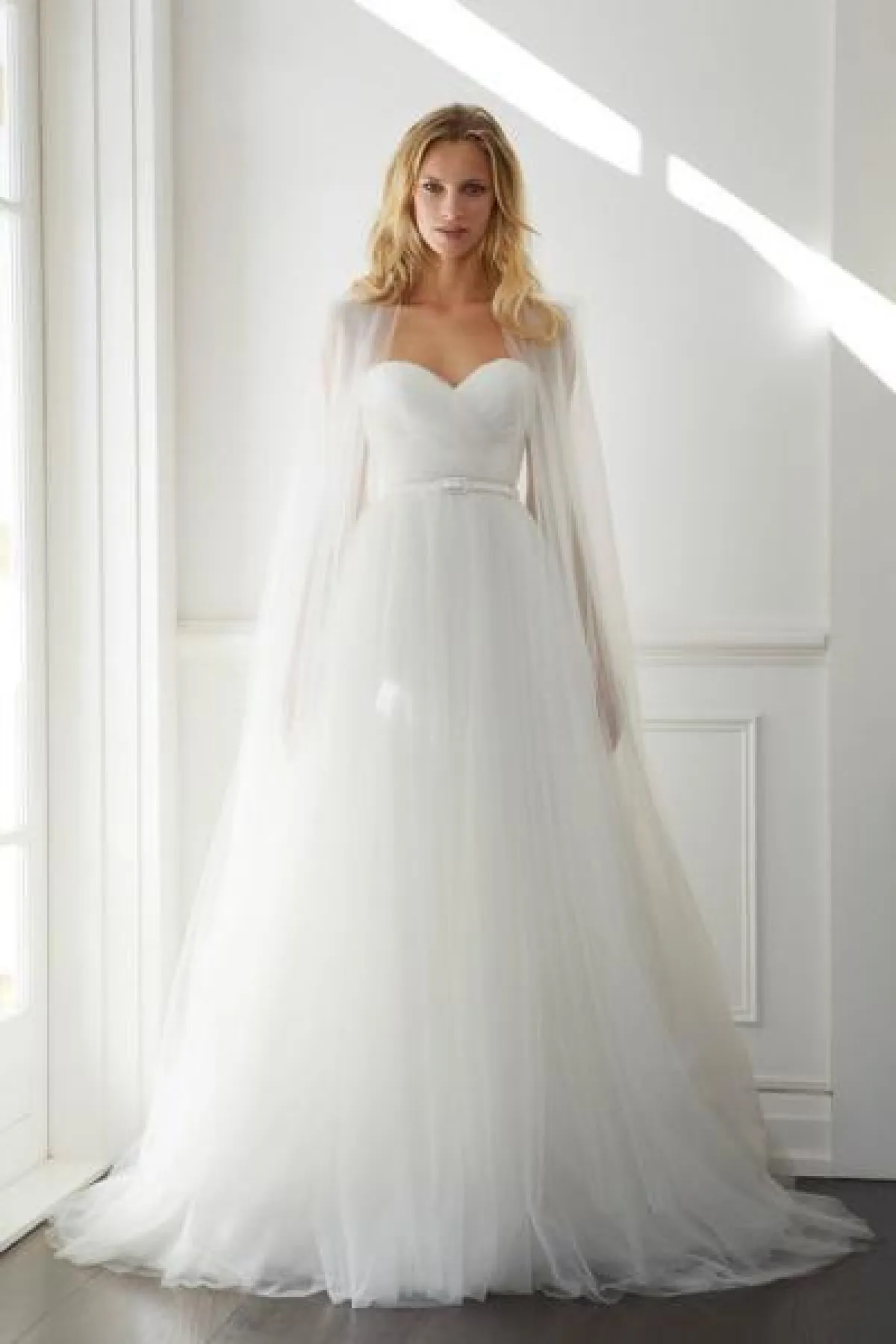 تتنوع ألوان فساتين الزفاف الرومانسية من الأبيض الصافي إلى البيج الخفيف.