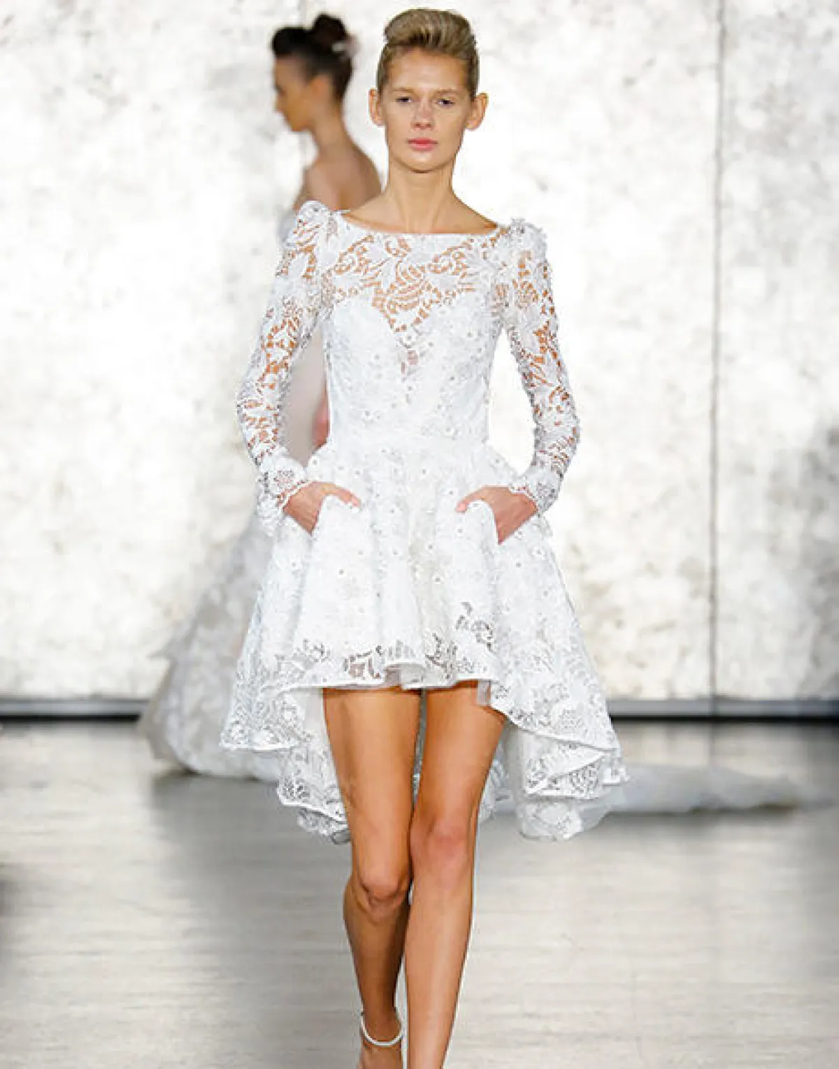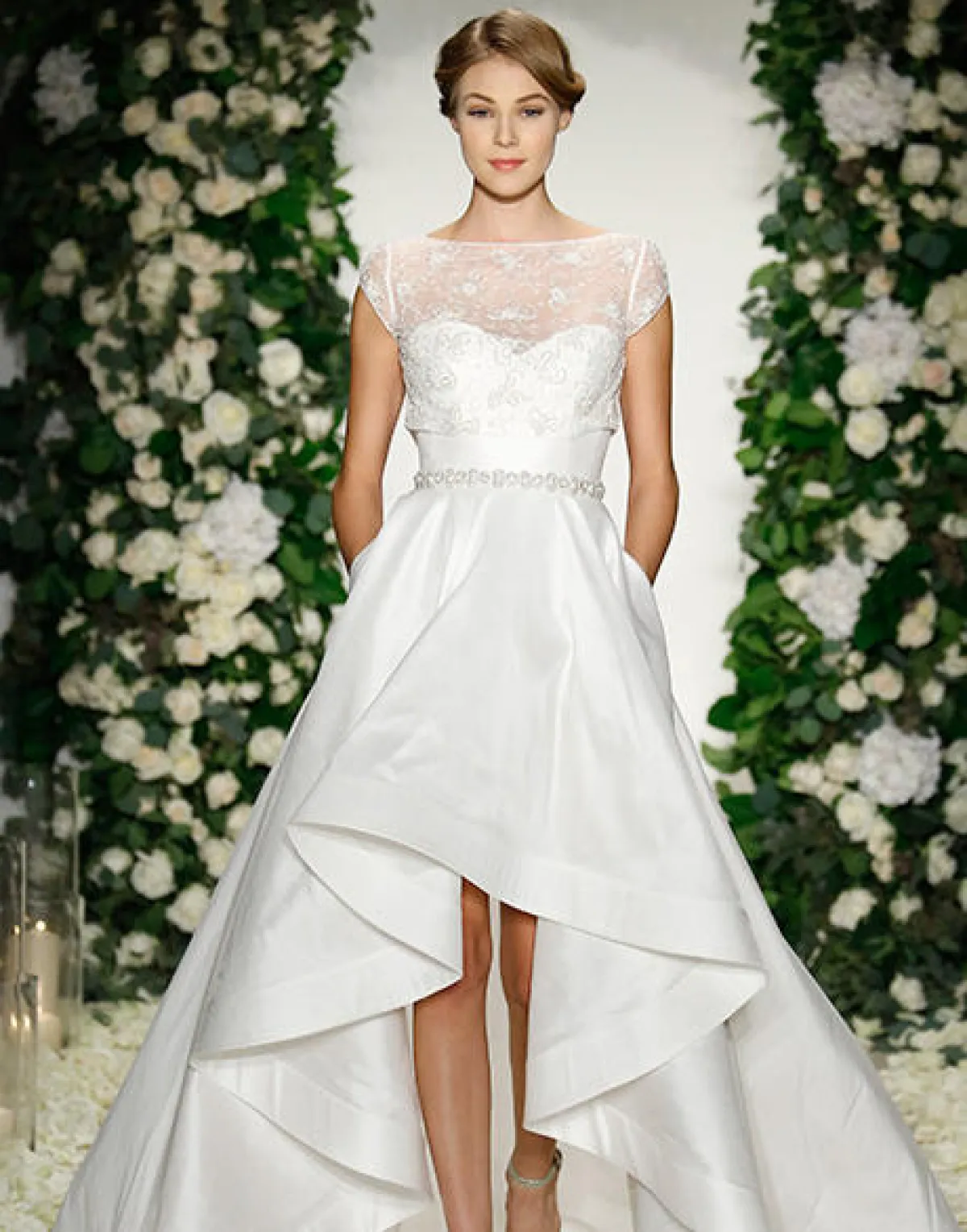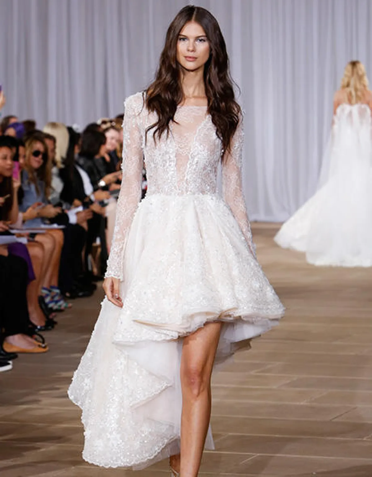 من صيحات هذا الموسم لعروس 2016 اخترنا لك قصة فساتين الزفاف القصيرة من الأمام والطويلة من الوراء.