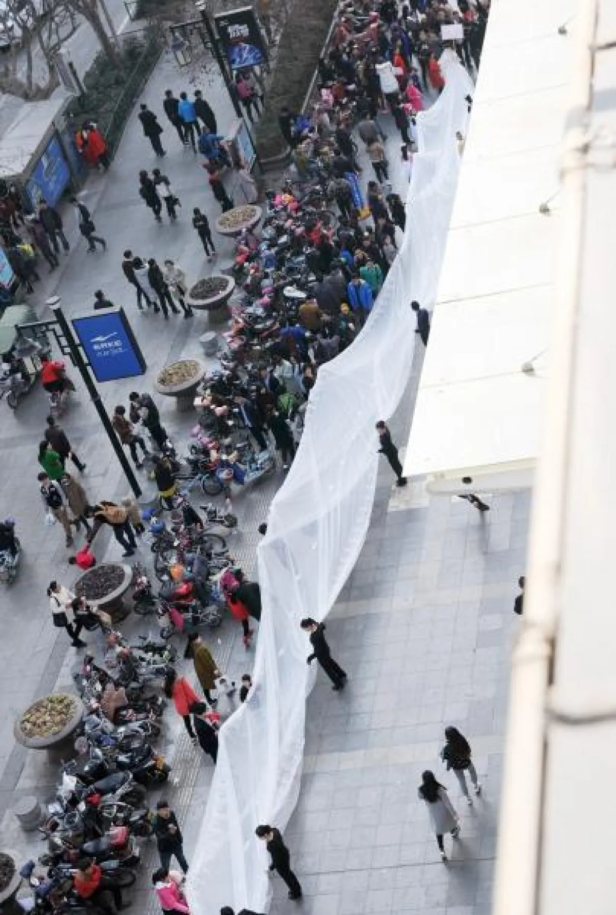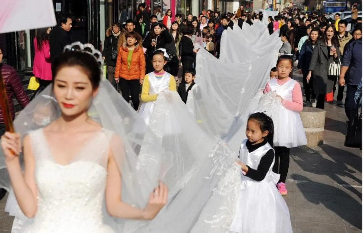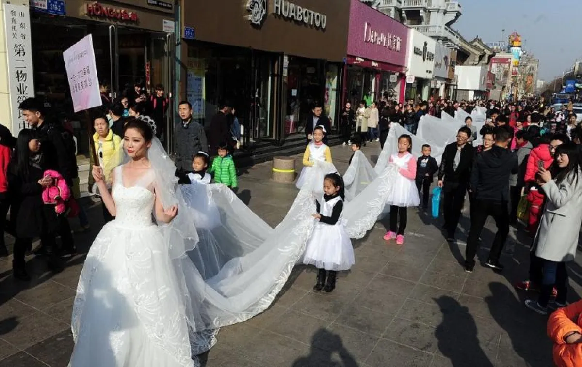 تجمّع الآلاف من سكان مدينة "جينان" الصينيّة لمشاهدة فستان زفاف مميّز صُمّم بذيلٍ طوله 100 متر.