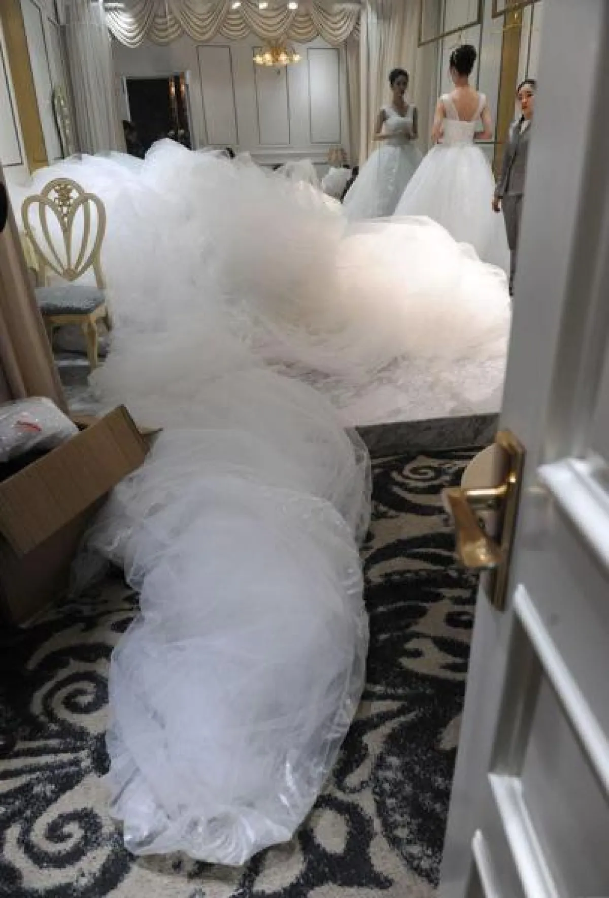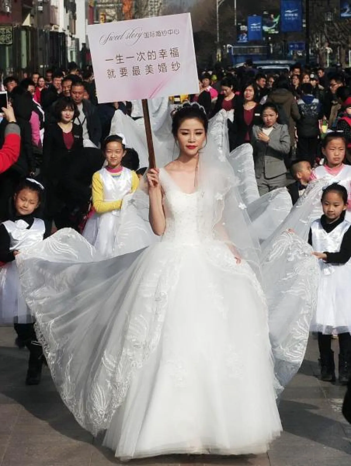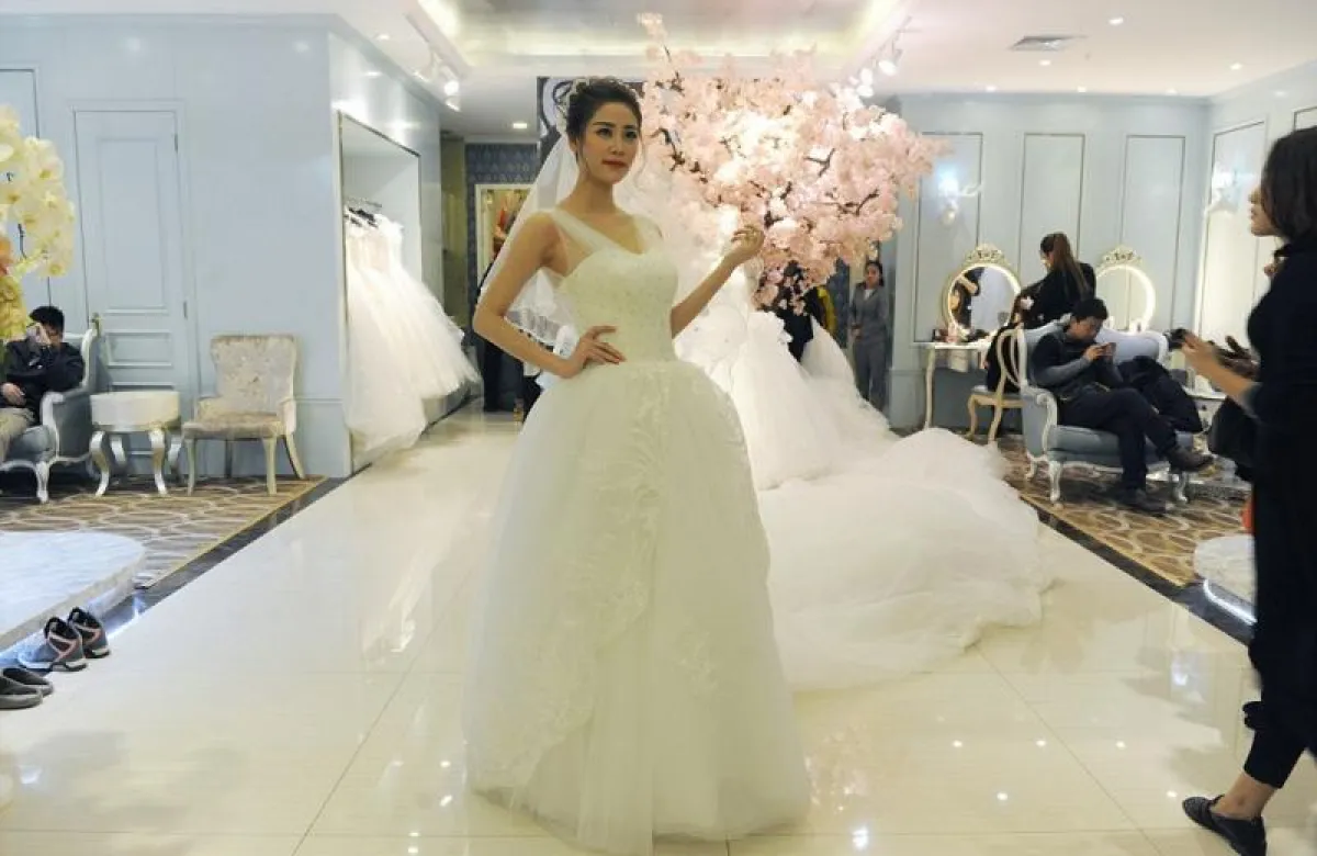 تجمّع الآلاف من سكان مدينة "جينان" الصينيّة لمشاهدة فستان زفاف مميّز صُمّم بذيلٍ طوله 100 متر.