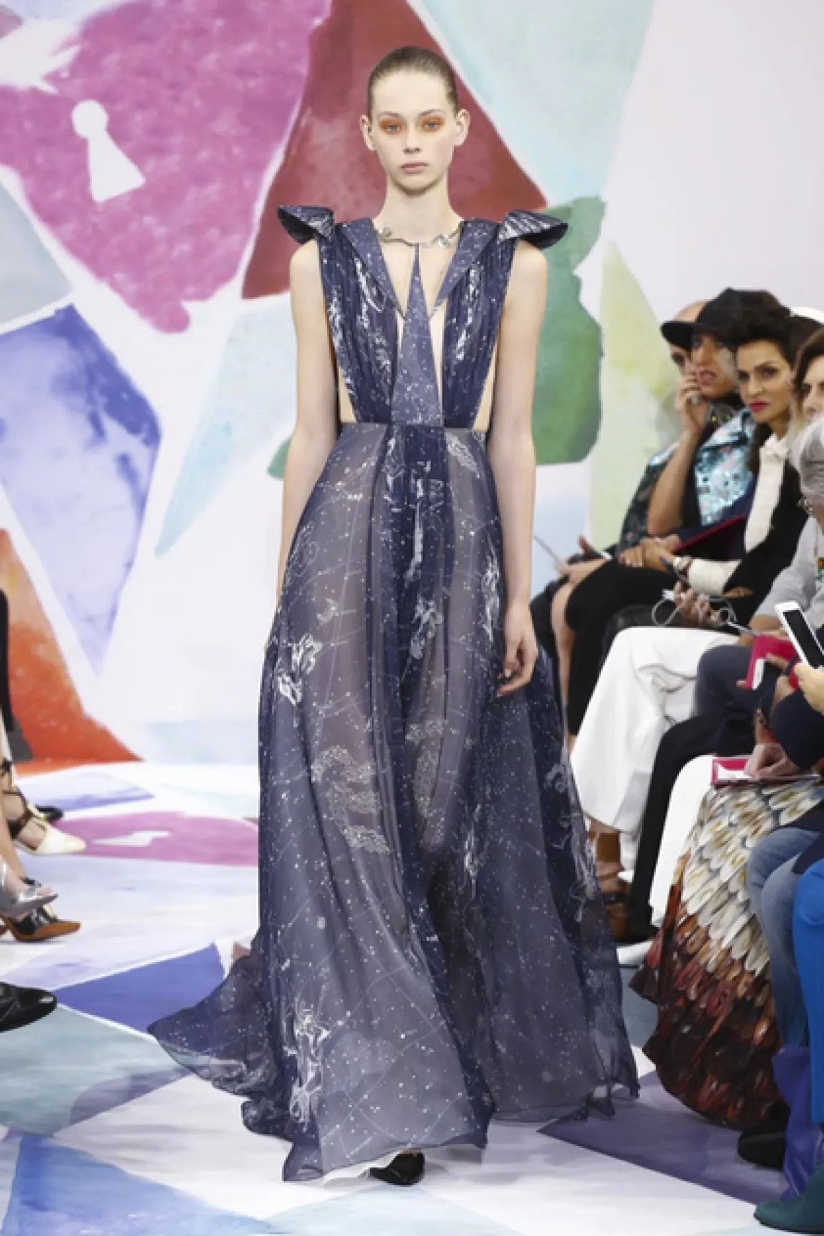 في اليوم الثاني من أسبوع باريس للأزياء الفاخرة لخريف وشتاء 2016- 2017، عرضت دار الأزياء العالمية سكياباريللي Schiaparelli Couture مجموعتها الرائعة، معتمدة على الألوان الراكزة والدافئة، التي توحي بالسماء والكواكب الحالمة مع التصميمات المطرّزة، التي بدت بألوان السماء.
