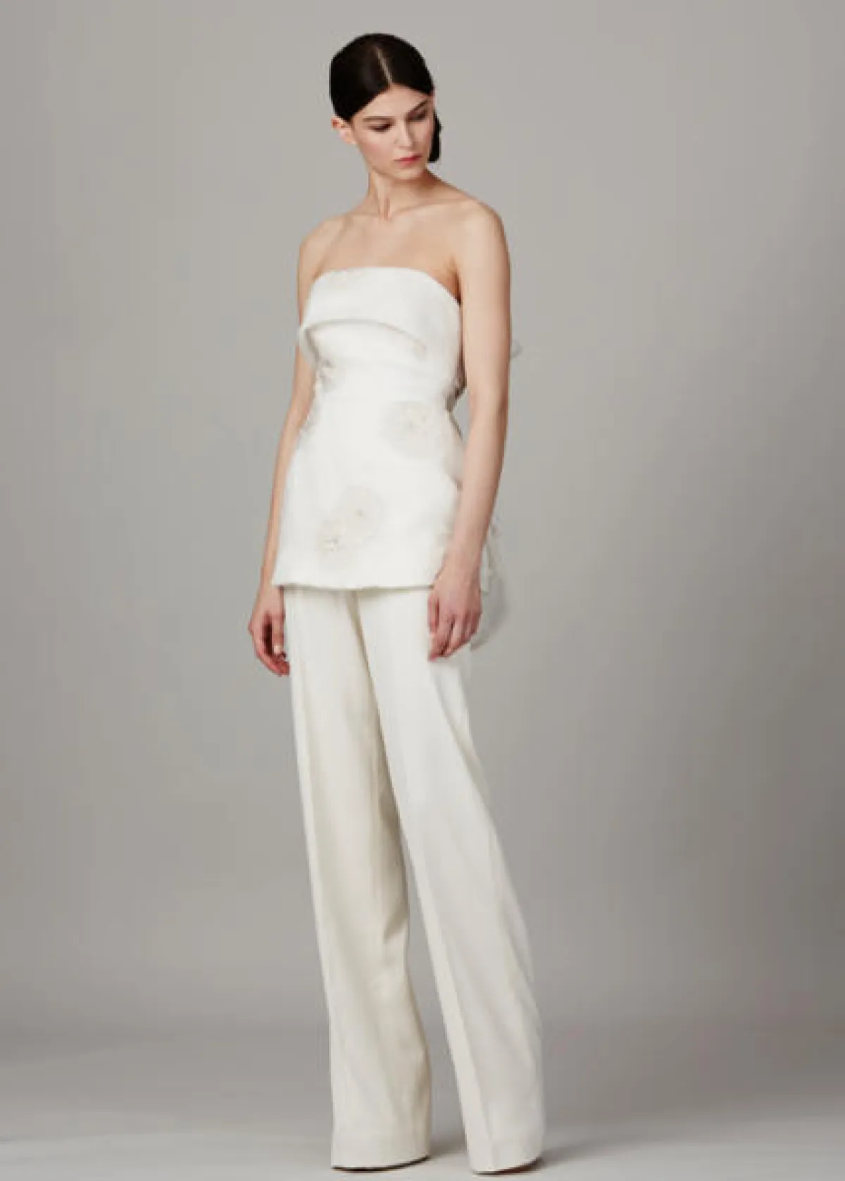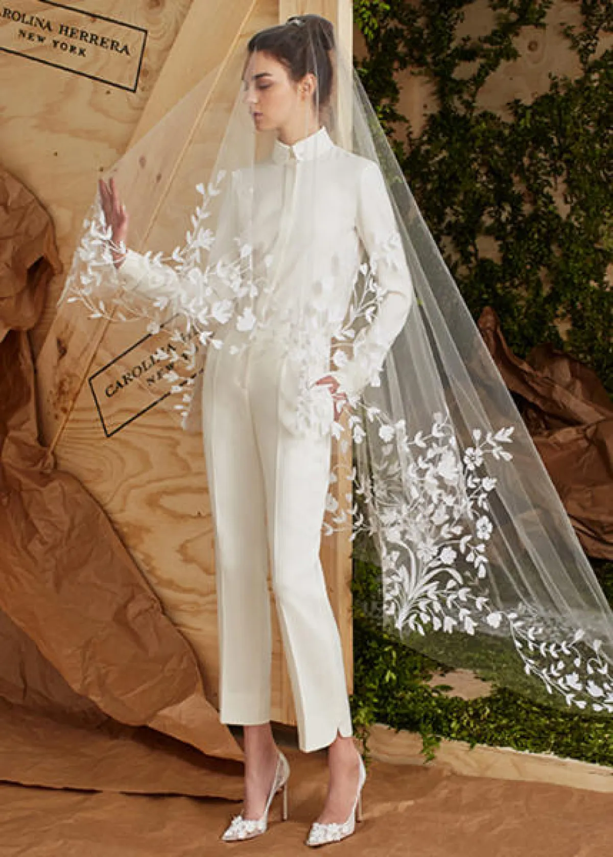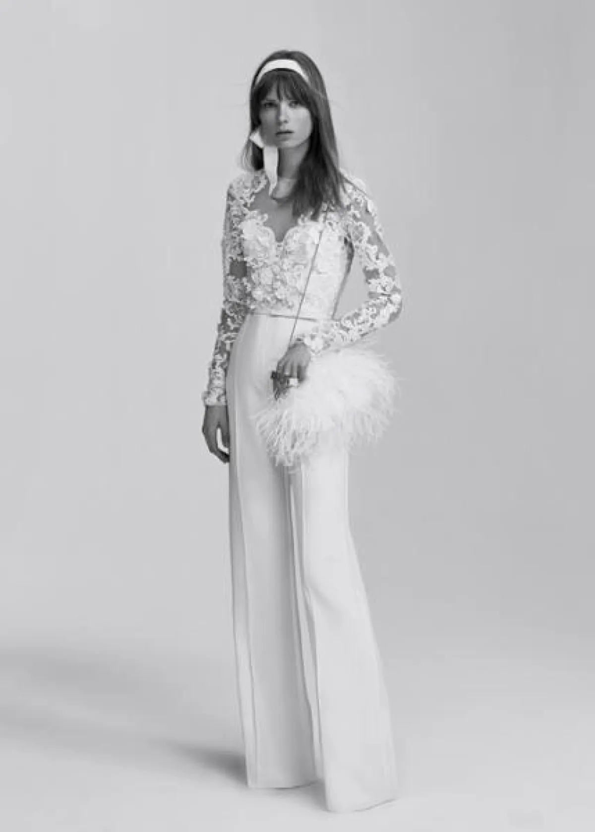 هل تسعين للحصول على إطلالة جريئة وعصرية يوم زفافك؟ إذاً سنقدم لك في هذا الألبوم صوراً لصيحة رائجة خلال الموسم المقبل وهو تصميم البدلة البيضاء أو Pant Suit.