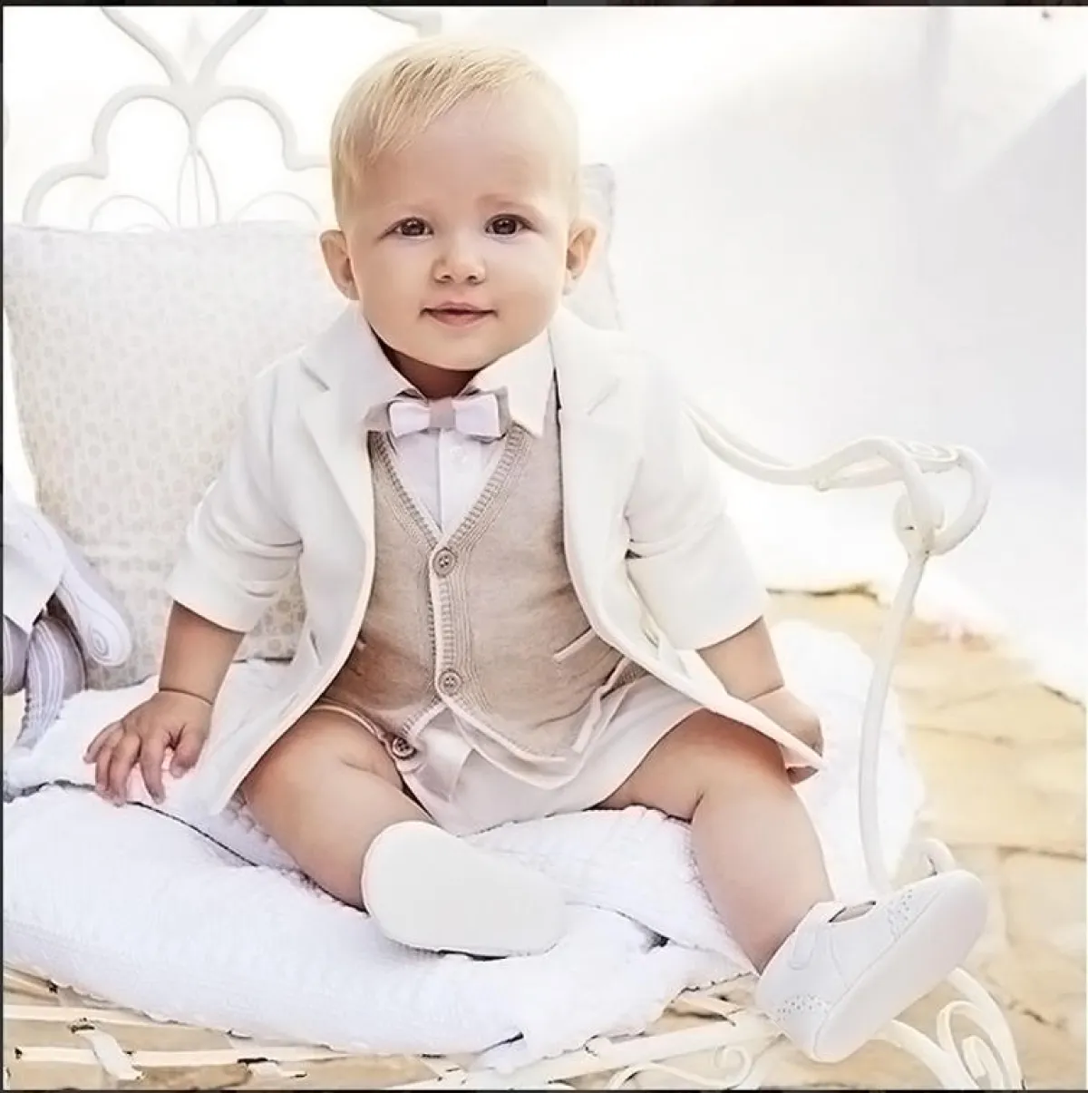 شورت أبيض وجاكيت رسمي مع فيست صوف باللون البيج