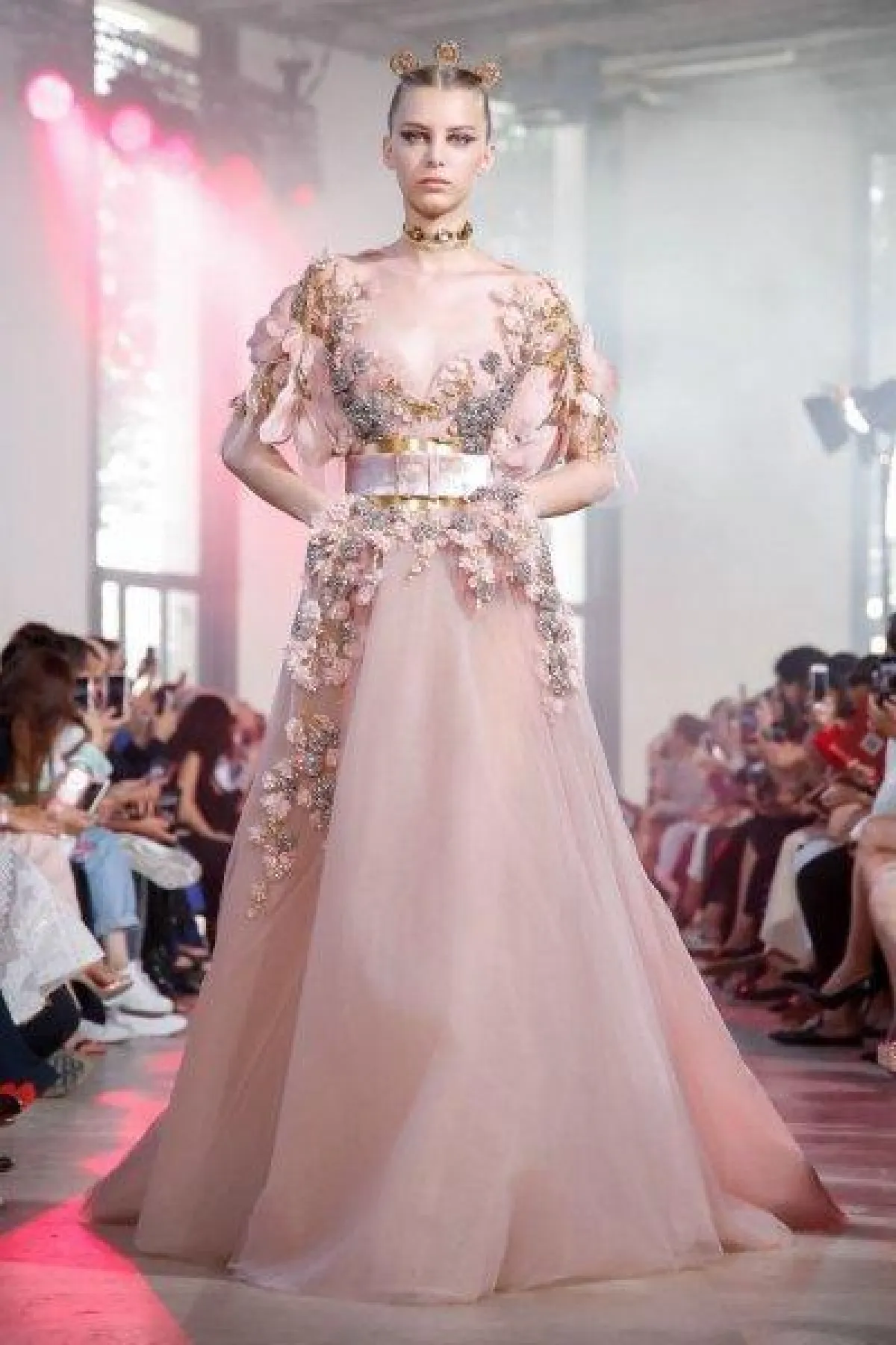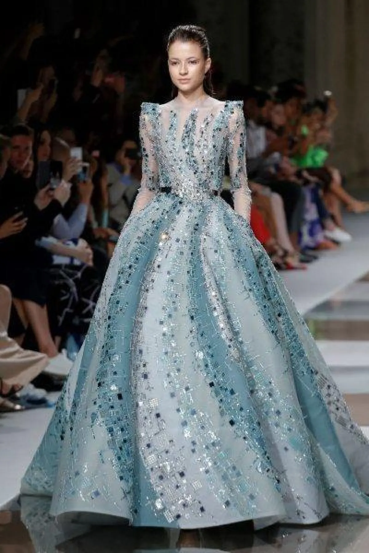 وبرزت بعض الألوان الناعمة في فساتين ايلي صعب مثل الأزرق الفاتح والوردي والنيود.
