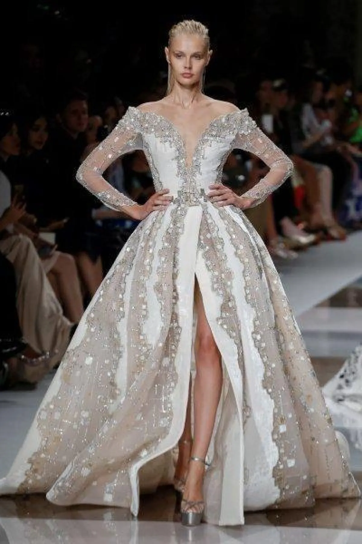 وغلبت التصاميم بالقصّة الـA Line على فساتين ايلي صعب، مع صيحات مختلفة مثل الفساتين الأوف شولدر، الفساتين بالأكمام المنفوخة، والفساتين بصيحة الكاب الرائجة.