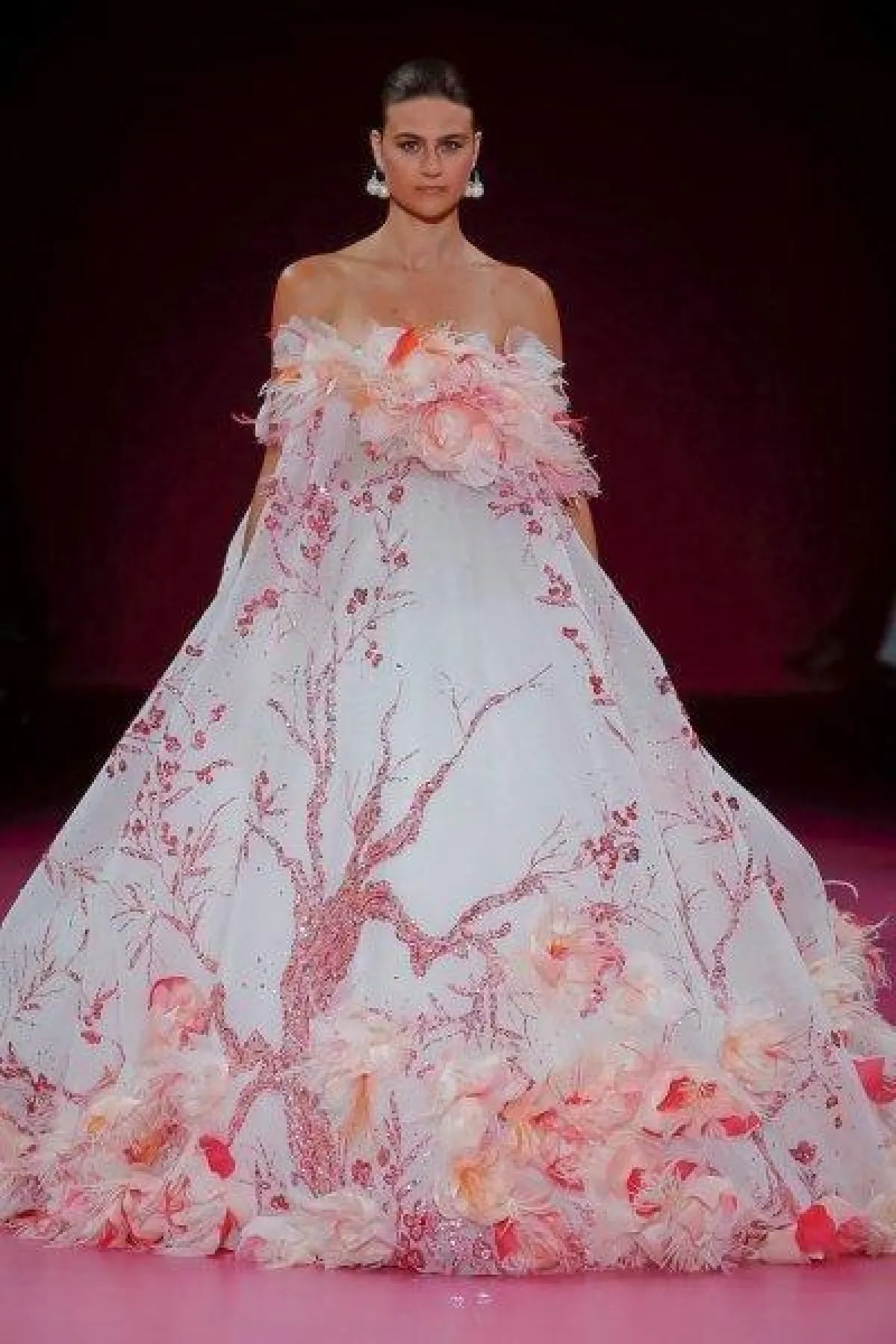 وتميزت فساتين جورج حبيقة بلمسات الأنوثة، حيث اللون الوردي مع صيحات مميزة مثل صيحة الطبقات وصيحة تطريزات الورود المستوحاة من الطبيعة.