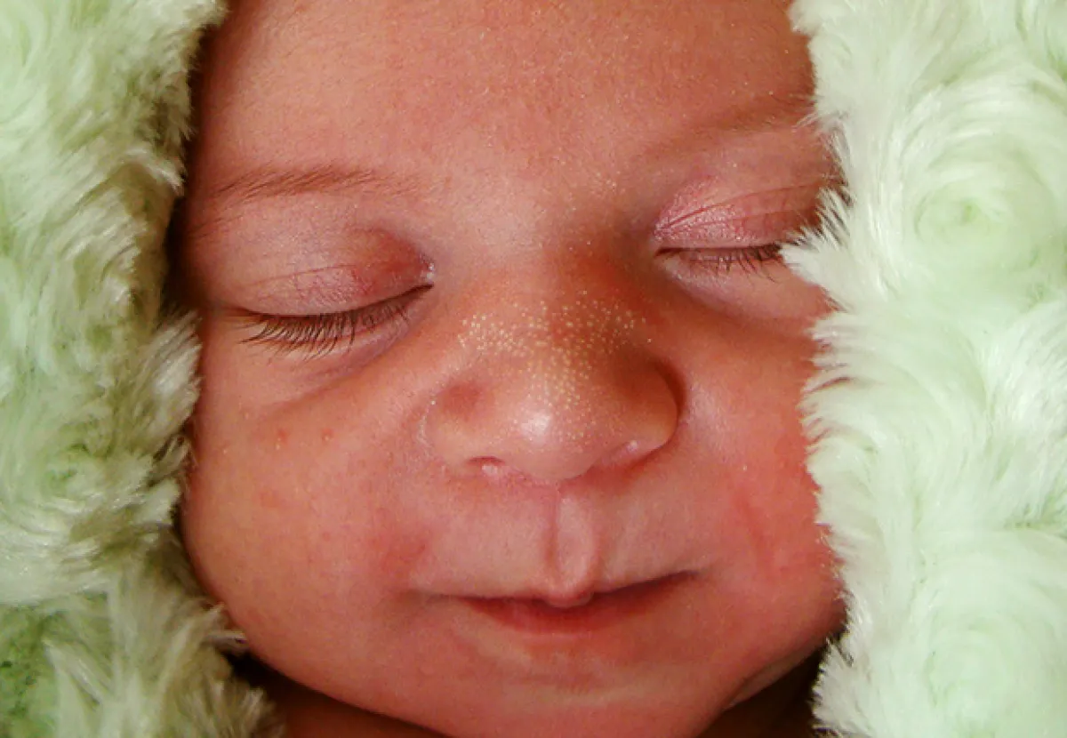 - نتوءات بيضاء صغيرة على الأنف والوجه: تتطور بسبب انسداد الغدد في الجلد. تميل إلى التحسن مع فتح الغدد على مدى بضعة أيام أو أسابيع.