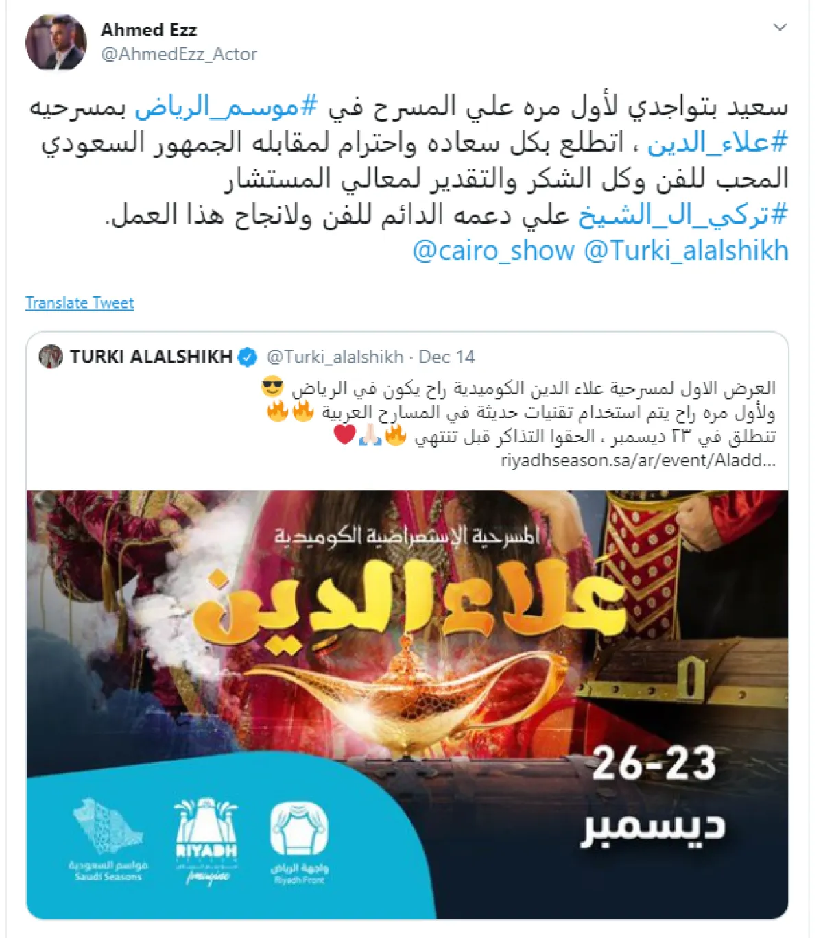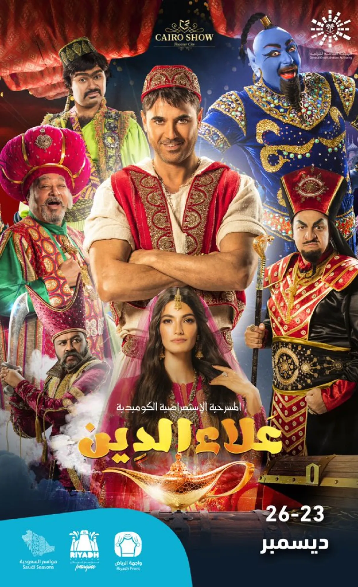 دعاية ضخمة ومختلفة لمسرحية علاء الدين في موسم الرياض تحت رعاية ودعم سيادة المستشار تركي آل الشيخ رئيس هيئة الترفيه لعرضها على مسرح الأميرة نور. وتعديل موعد العرض الأول ليكون من ٢٥ حتى ٢٨ ديسمبر. علاء الدين إنتاج Cairo Show . بطولة أحمد عز وإخراج مجدي الهواري@AhmedEzz_Actor pic.twitter.com/Ea1sseVou7