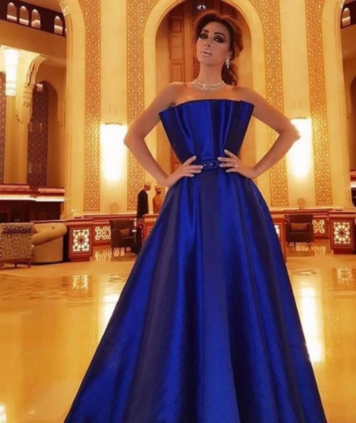 كما اختارت ميريام خلال هذا العام فستان باللون النيلي يكشف كتفيها مع خصر ضيق.