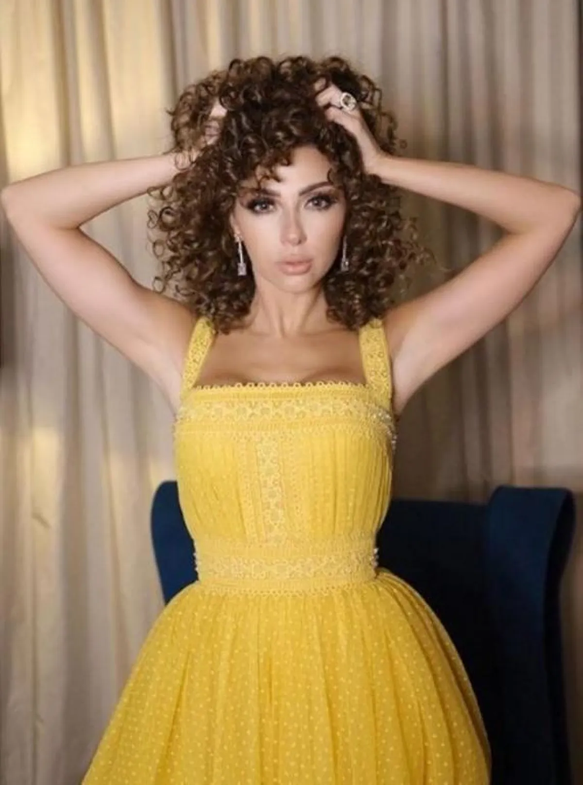 وفي احدى اطلالاتها اختارت فستان باللون الأصفر مطرز ومصمم بخصر نحيل.