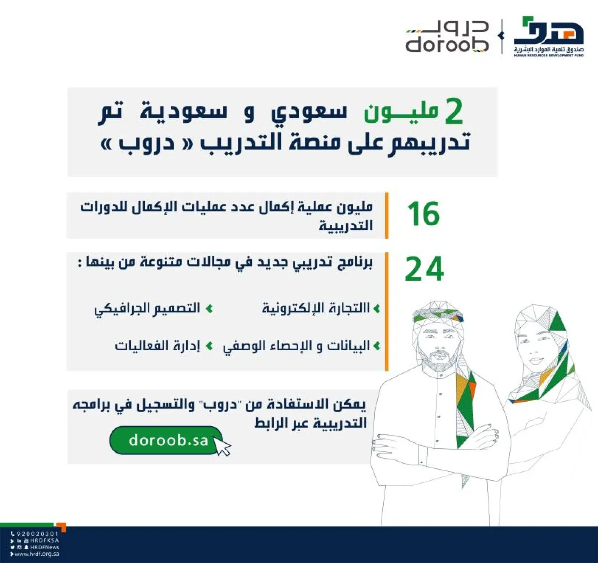 كشف مدير عام تطوير برامج التدريب في صندوق تنمية الموارد البشرية (هدف) والمشرف على برنامج التدريب الالكتروني (دروب) الأستاذ محمد بن عبدالعزيز الشويعر، عن التحاق 2 مليون سعودي وسعودية في دورات برنامج التدريب الالكتروني "دروب"، وبلغ عدد عمليات الإكمال للدورات التدريبية نحو 16 مليون عملية إكمال، منذ تدشين البرنامج في ديسمبر 2014م حتى نهاية نوفمبر الماضي.