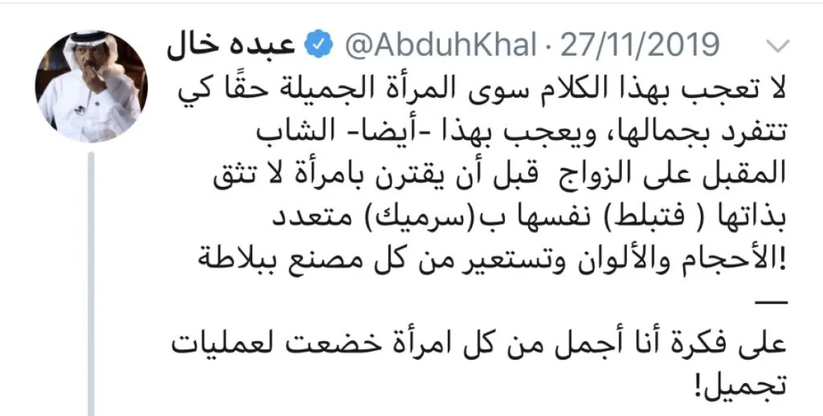 بعد موجة غضب اجتاحت مواقع التواصل ردّ الكاتب عبده خال في حسابه الرسمي على تويتر مغرداً: «لا عجب بهذا الكلام سوى المرأة الجميلة حقاً كي تتفرد بجمالها، ويعجب بهذا -أيضاً- الشاب المقبل على الزواج قبل أن يقترن بامرأة لا تثق بذاتها فـ«تبلط» نفسها بـ«سراميك» متعدد الأحجام والألوان، وتستعير من كل مصنع بلاطة! على فكرة أنا أجمل من كل امرأة خضعت لعمليات تجميل!».