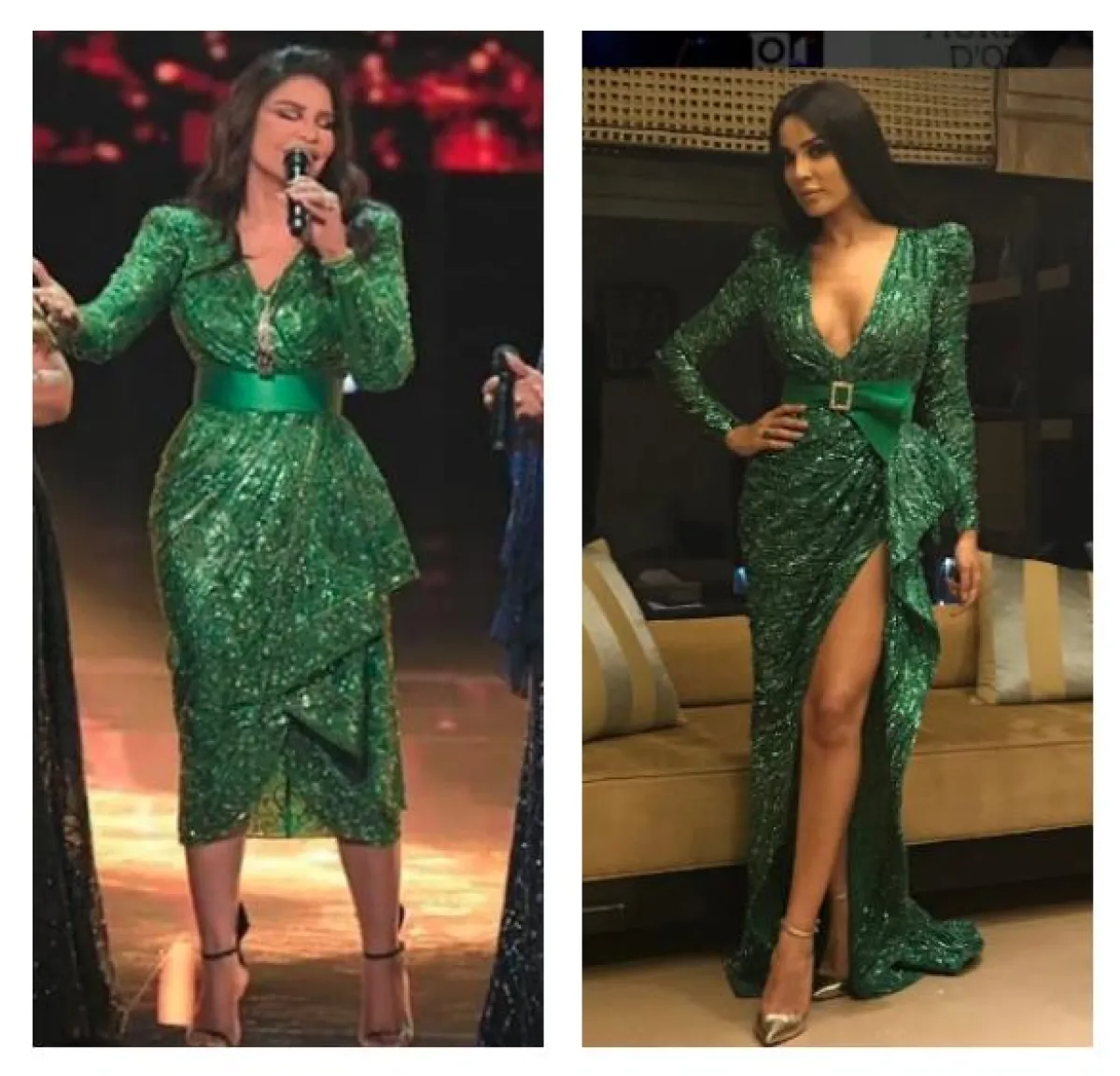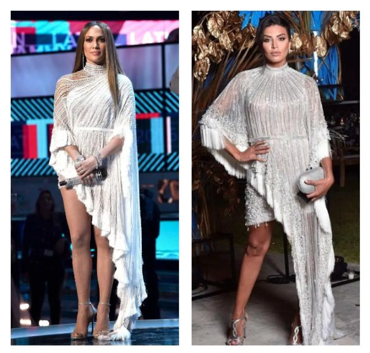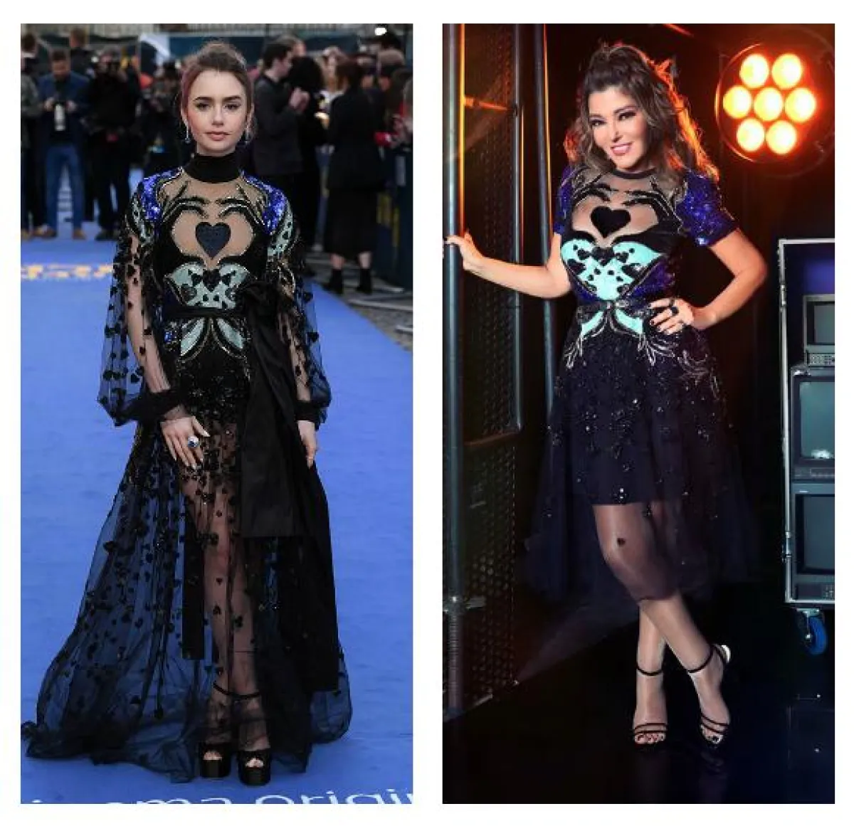 الفساتين البراقة عشق النجمات العربيات لا سيما وإن حملت توقيع مصمم الأزياء الفرنسي Alexandre Vauthier، وهنا قد شادهنا كلًّا من نانسي عجرم وكارلا حداد في الفستان البراق نفسه باللون الأزرق البنفسجي بقصة الكتف الواحدة مع فتحة على الساق، وقد اعتمدته كلّ منهما على طريقتها الخاصة، حيث اطلالة نانسي كانت أكثر نعومة واطلالة كارلا كانت أكثر جرأة.