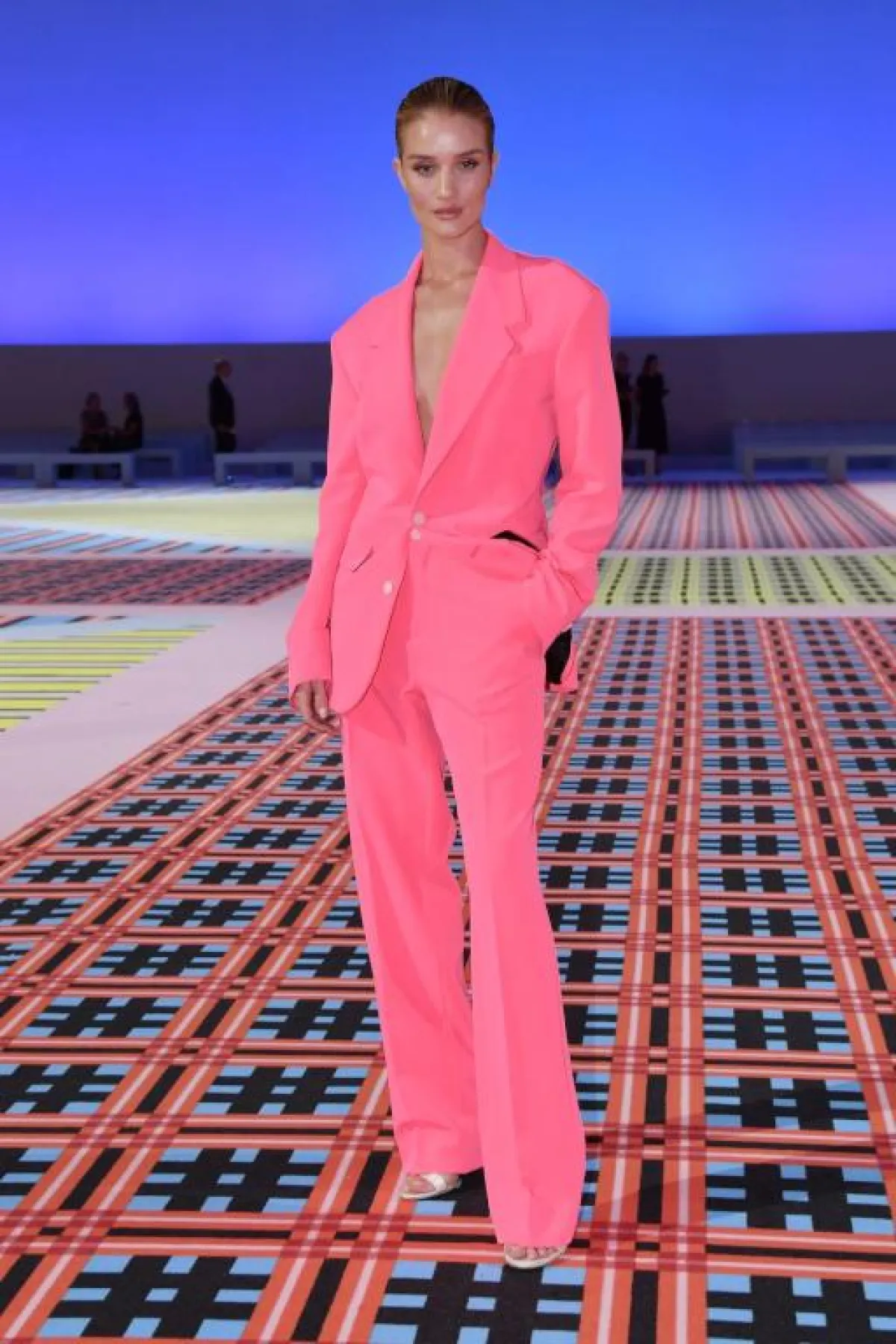 اختارت عارضة الأزياء روزي هنتنغتون وايتلي، بدلة باللون الزهري الساطع، كانت ضمن مجموعة دار فيرساتشي لـ 2019. ونسقتها مع صندل باللون الفضي اللامع.