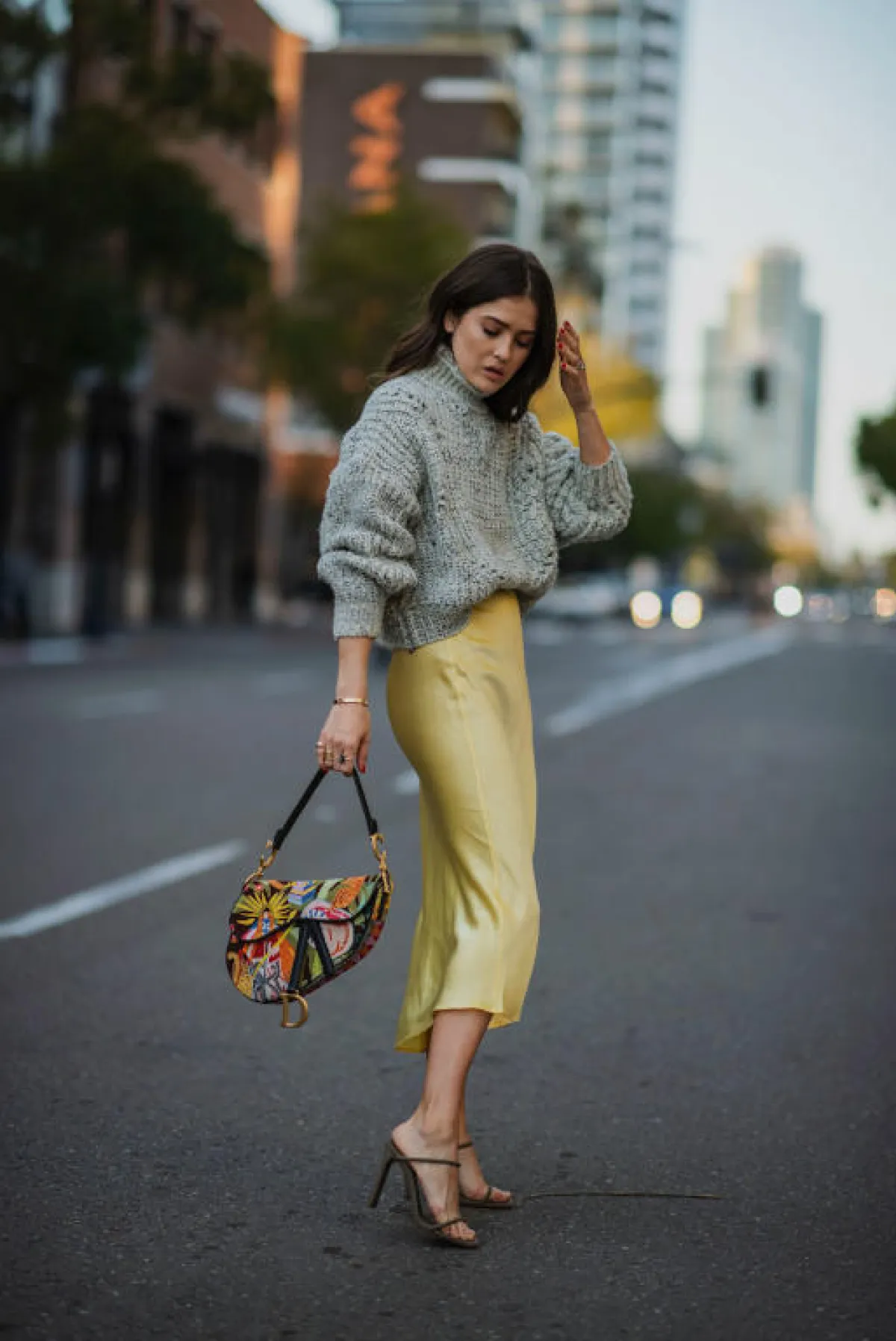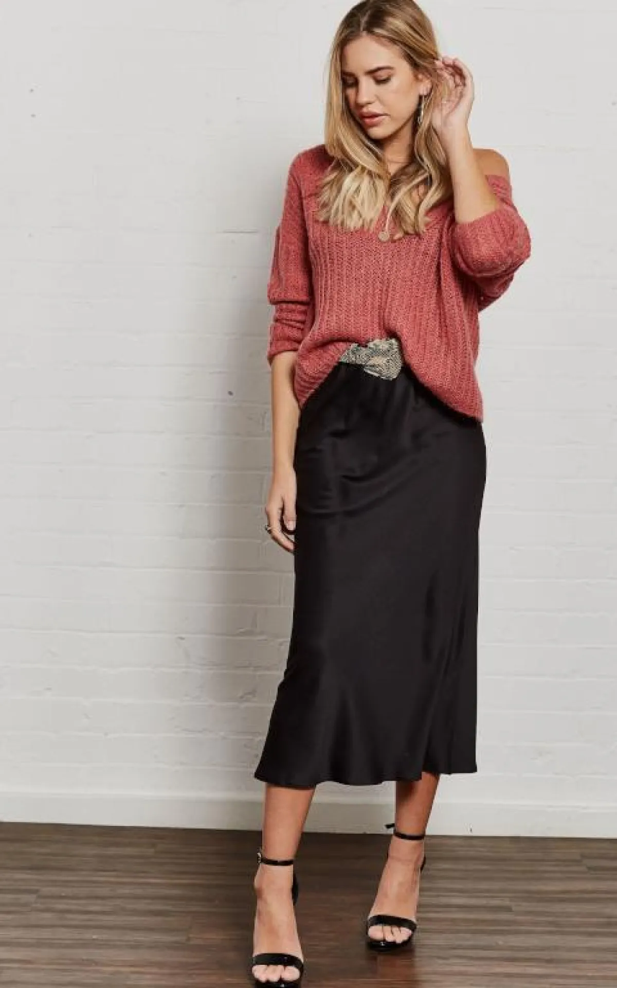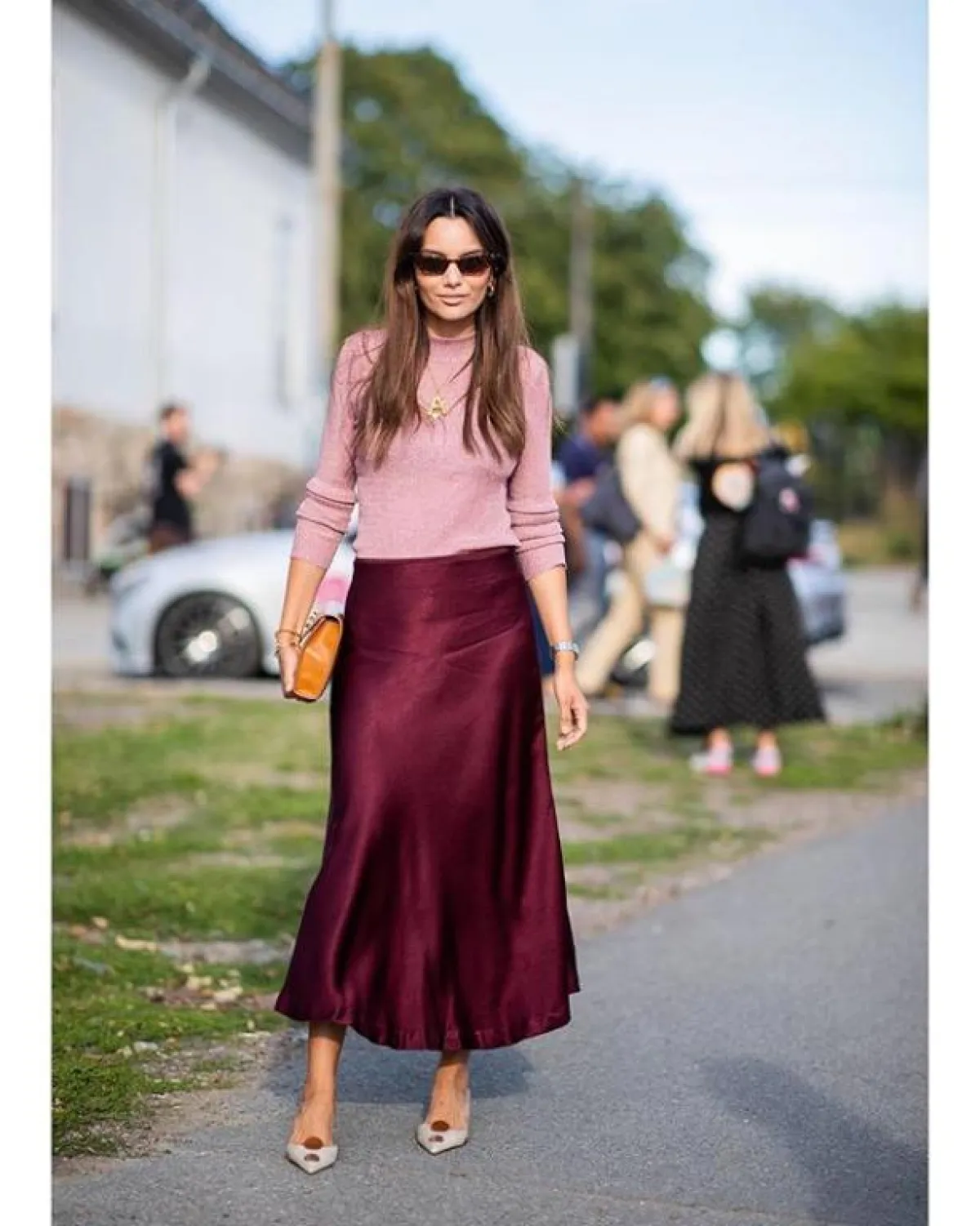 أفضل ما في الأمر هو أنّ التنورة الميدي متعددة الاستخدامات وسهلة الارتداء. ارتديها بقصة محبوكة من الخصر مع البلوزات الصيفية المربوطة من الأمام. أما في الجو البارد، فيمكنكِ تنسيقها مع كنزة صوفية وحذاء البوت برقبة عالية تظهر من الشق الأمامي على سبيل المثال.